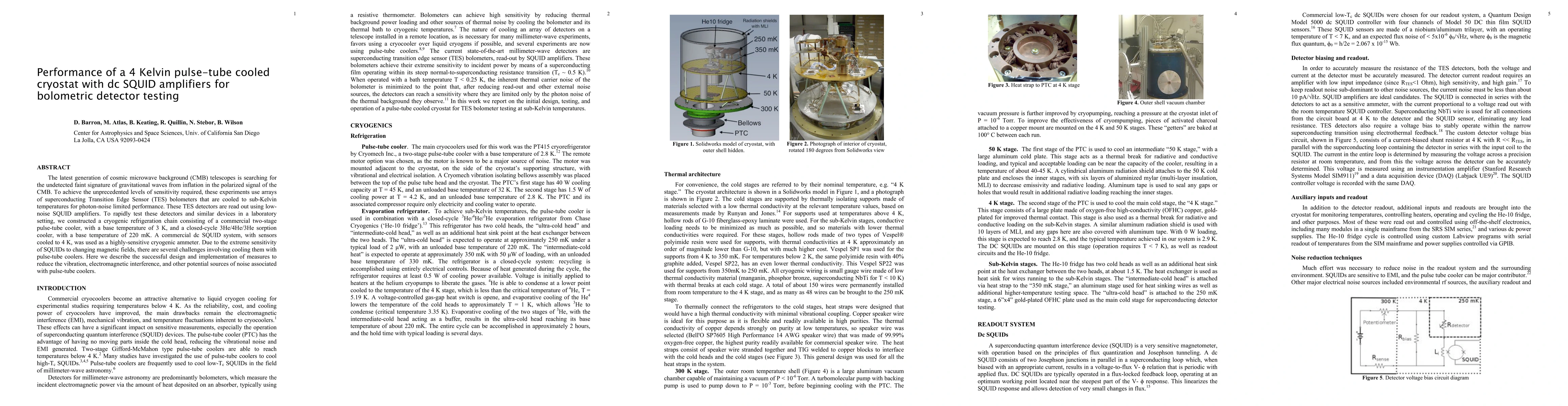 This paper details the construction and performance of a cryogenic system using a pulse-tube cooler and sorption cooler to achieve 4 K for testing superconducting bolometers in CMB experiments. The system employs dc SQUID amplifiers to mitigate noise, addressing challenges like vibration and electromagnetic interference from the pulse-tube cooler.