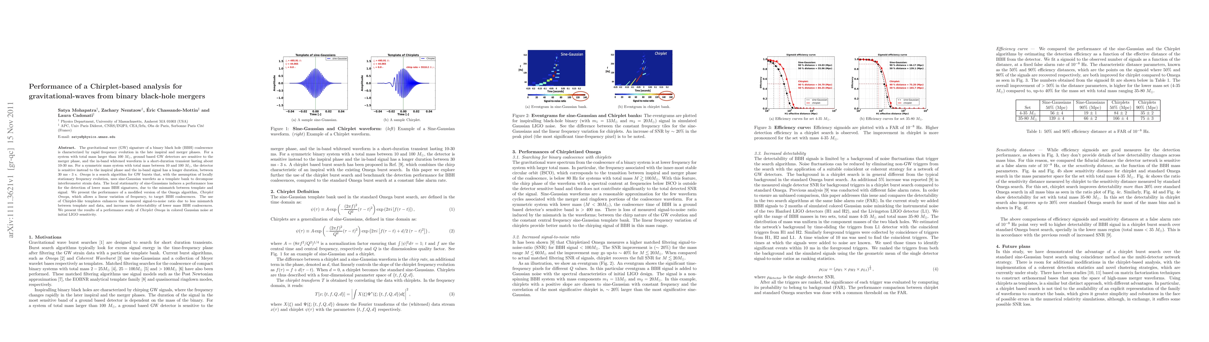 This paper evaluates the Chirplet Omega algorithm for detecting gravitational waves from binary black hole mergers, showing improved signal-to-noise ratio and enhanced detectability of lower mass systems compared to traditional sine-Gaussian templates. The study demonstrates the algorithm's performance in colored Gaussian noise at initial LIGO sensitivity.