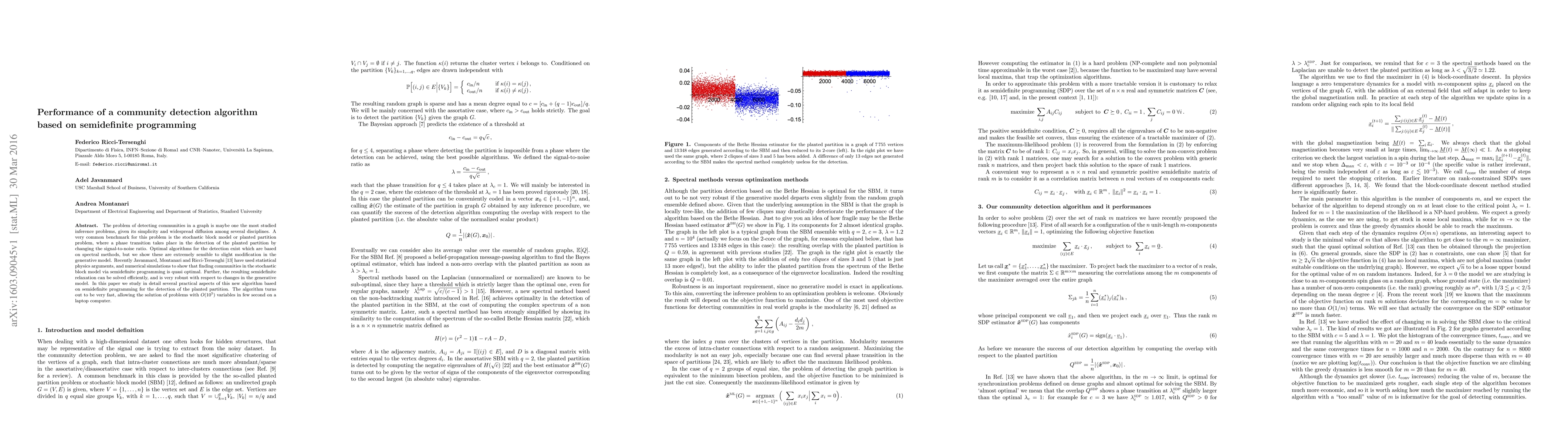 This paper investigates a community detection algorithm based on semidefinite programming, demonstrating its efficiency and robustness. The algorithm is shown to be quasi-optimal and capable of solving problems with up to $10^5$ variables quickly, even on standard computing hardware.
