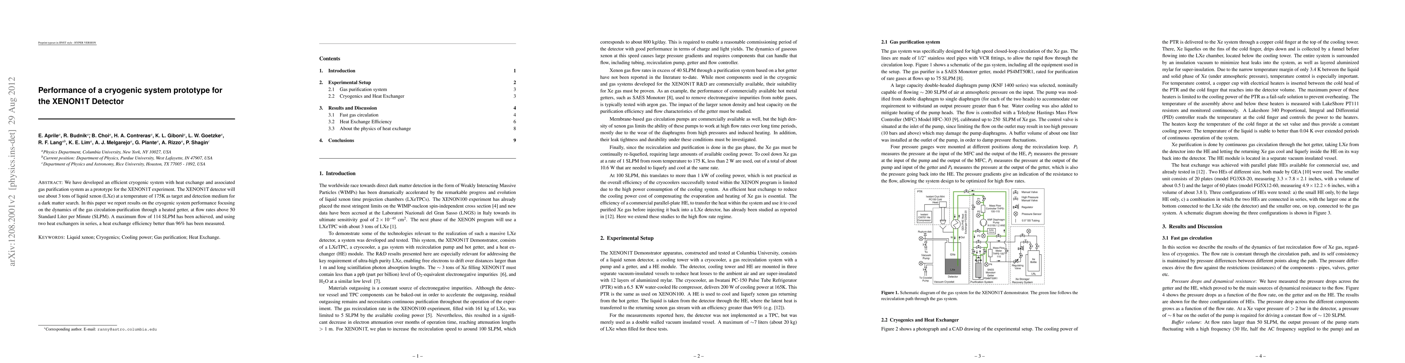 This paper presents a cryogenic system prototype for the XENON1T dark matter detector, achieving a maximum gas flow rate of 114 SLPM and a heat exchange efficiency of over 96% using two parallel heat exchangers. The system is designed to manage the circulation and purification of gas through a heated getter.