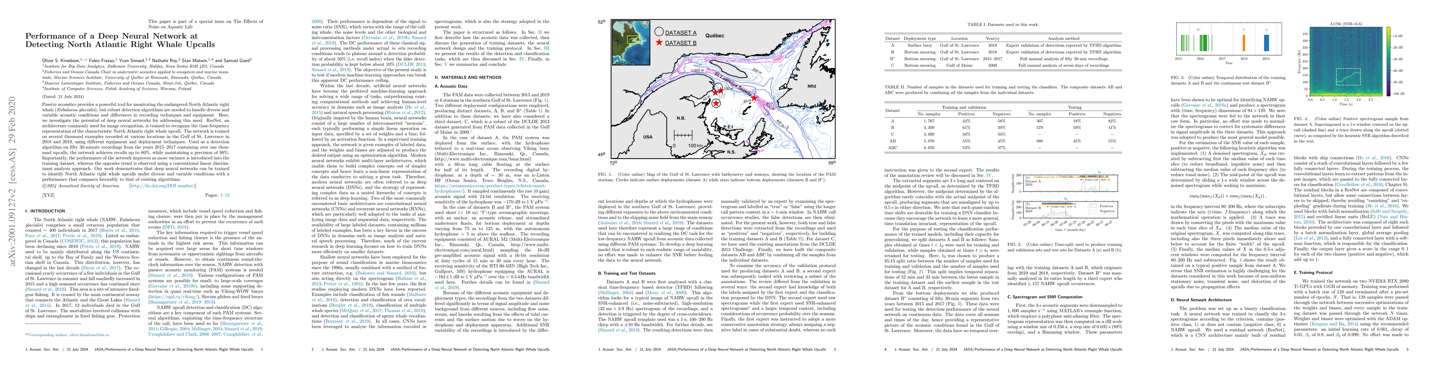 This study trains a ResNet deep neural network to detect North Atlantic right whale upcalls using passive acoustic monitoring, achieving high recall and precision. The network's performance improves with greater training dataset variance, outperforming conventional linear discriminant analysis.