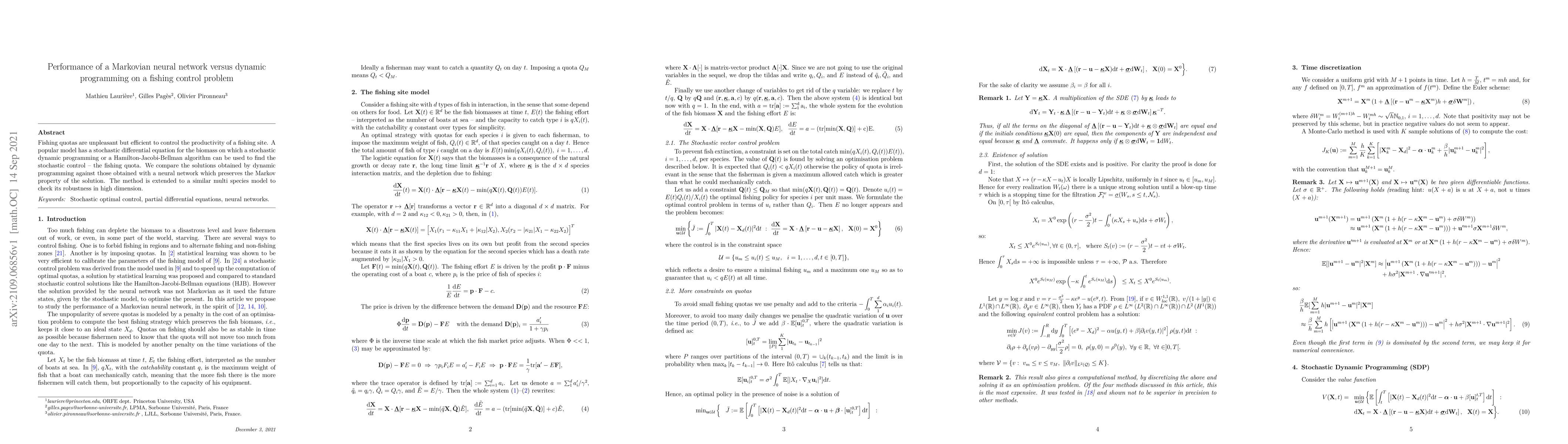 Fishing quotas are unpleasant but efficient to control the productivity of a fishing site. A popular model has a stochastic differential equation for the biomass on which a stochastic dynamic programming or a Hamilton-Jacobi-Bellman algorithm can be used to find the stochastic control -- the fishing quota. We compare the solutions obtained by dynamic programming against those obtained with a neural network which preserves the Markov property of the solution. The method is extended to a similar multi species model to check its robustness in high dimension.