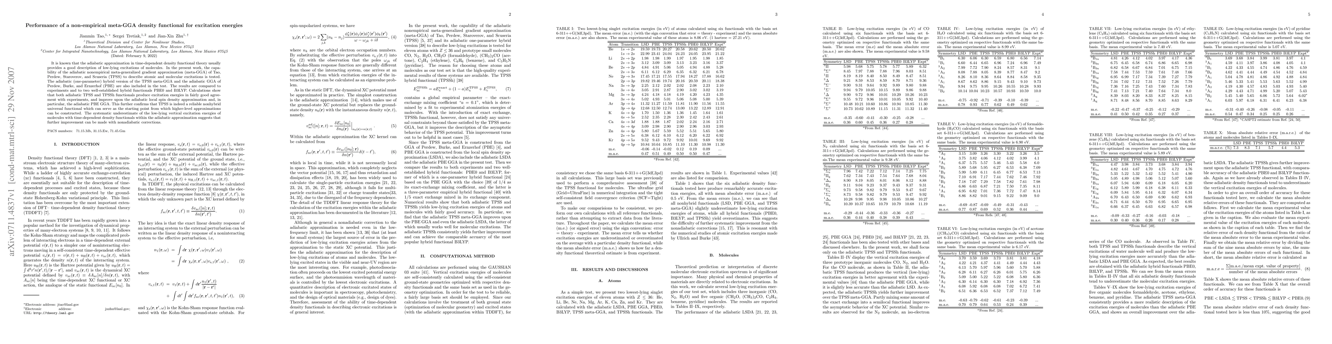 This study evaluates the performance of the TPSS meta-GGA functional for describing atomic and molecular excitation energies, showing it provides results in good agreement with experiments compared to other GGA and hybrid functionals. Further improvements may be possible through nonadiabatic corrections.