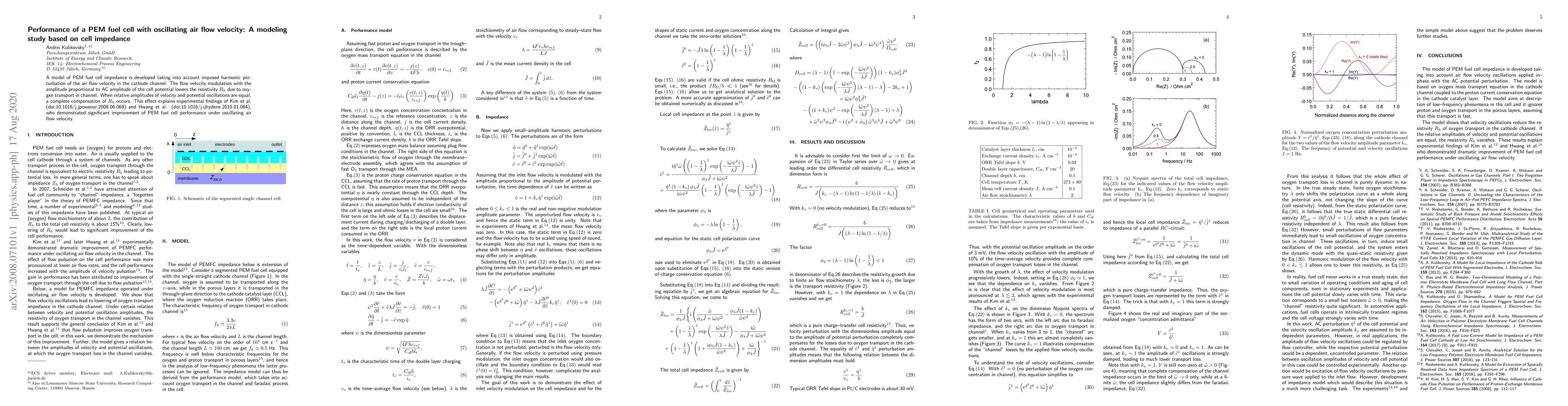 This study models a PEM fuel cell's impedance under harmonic perturbations of air flow velocity in the cathode channel, finding that modulating flow velocity proportionally to cell potential oscillations can significantly reduce resistivity due to oxygen transport. Equal relative amplitudes of velocity and potential oscillations completely compensate for this resistivity, explaining experimental results showing improved fuel cell performance.