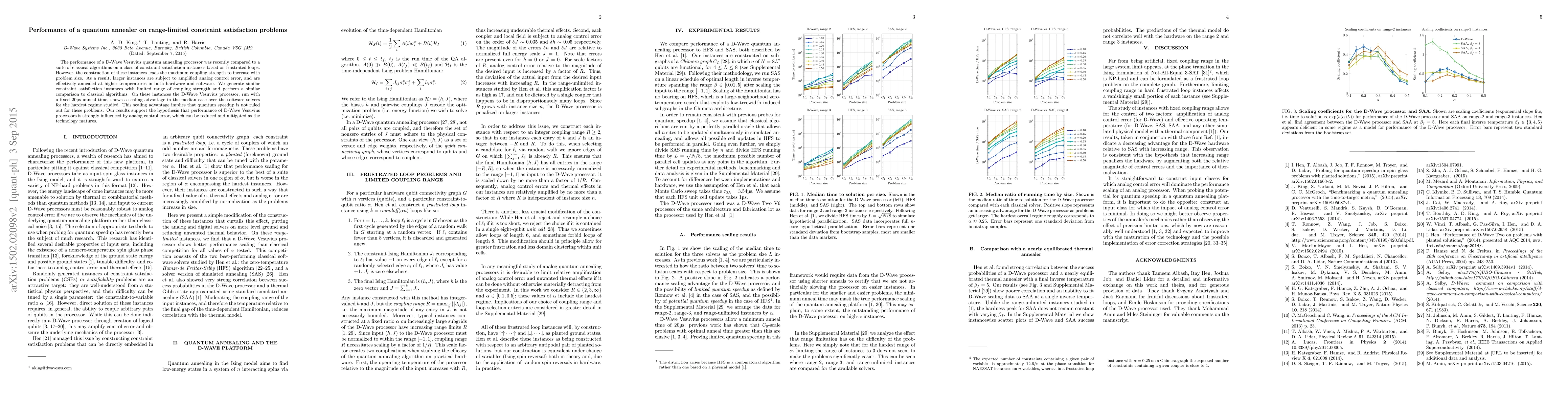 This research compares a D-Wave Vesuvius quantum annealer to classical algorithms on constraint satisfaction problems with limited coupling range. The study reveals that the quantum annealer demonstrates a scaling advantage over software solvers for challenging instances, suggesting potential quantum speedup. It also highlights that analog control error significantly impacts the quantum annealer's performance, which could be mitigated as technology advances.