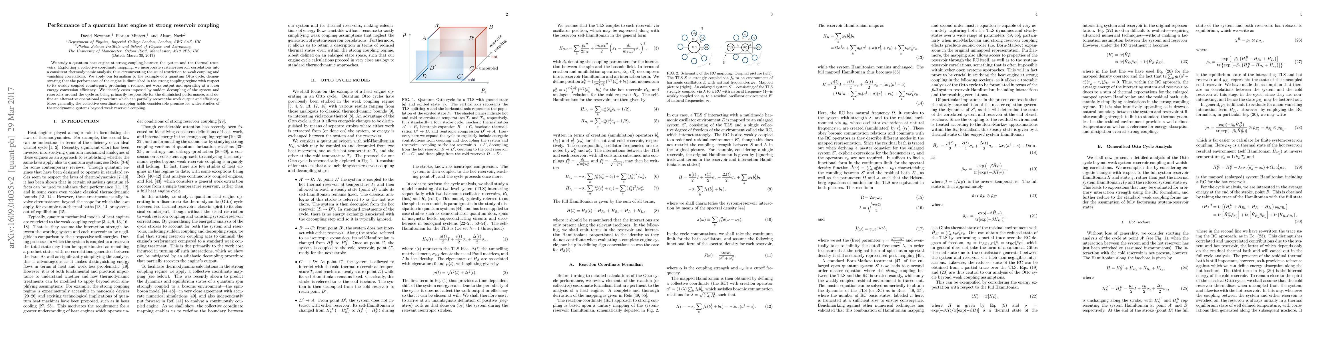 A quantum heat engine's performance is reduced when strongly coupled to its thermal reservoirs, but an alternative operational procedure can partially recover work output and efficiency. This finding highlights the need for collective coordinate mapping in thermodynamic analysis beyond weak coupling.