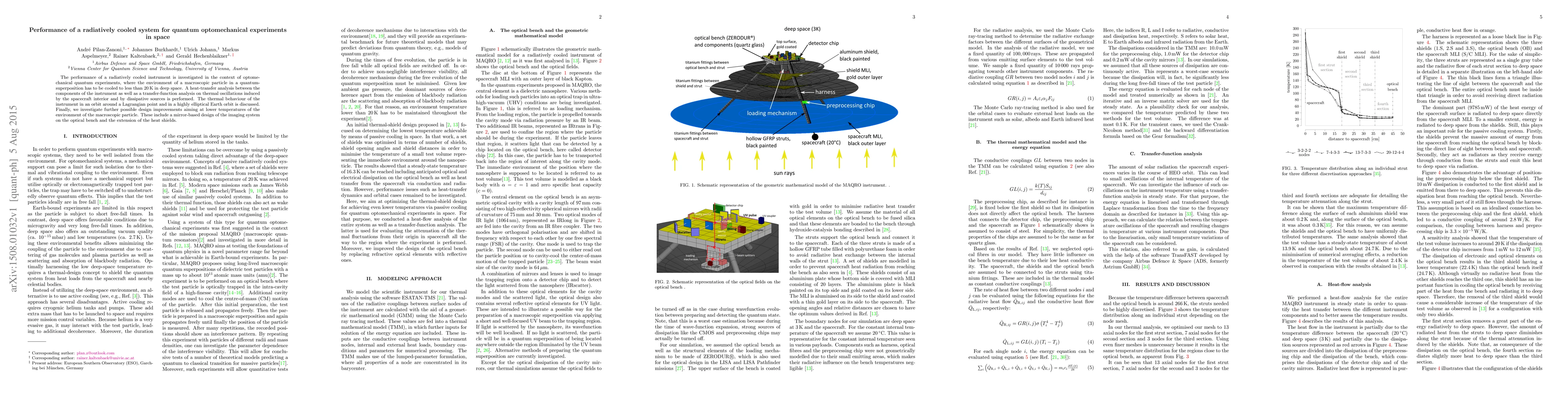 The performance of a radiatively cooled instrument is investigated in the context of optomechanical quantum experiments, where the environment of a macroscopic particle in a quantum-superposition has to be cooled to less than 20\,K in deep space. A heat-transfer analysis between the components of the instrument as well as a transfer-function analysis on thermal oscillations induced by the spacecraft interior and by dissipative sources is performed. The thermal behaviour of the instrument in an orbit around a Lagrangian point and in a highly elliptical Earth orbit is discussed. Finally, we investigate further possible design improvements aiming at lower temperatures of the environment of the macroscopic particle. These include a mirror-based design of the imaging system on the optical bench and the extension of the heat shields.
