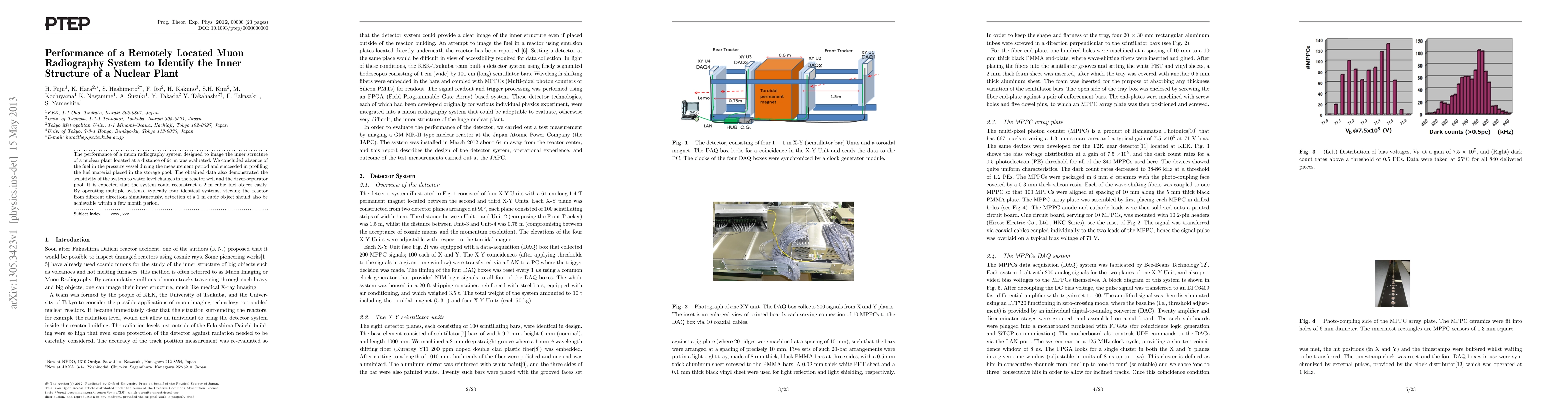 The performance of a muon radiography system designed to image the inner structure of a nuclear plant located at a distance of 64 m was evaluated. We concluded absence of the fuel in the pressure vessel during the measurement period and succeeded in profiling the fuel material placed in the storage pool. The obtained data also demonstrated the sensitivity of the system to water level changes in the reactor well and the dryer-separator pool. It is expected that the system could reconstruct a 2 m cubic fuel object easily. By operating multiple systems, typically four identical systems, viewing the reactor from different directions simultaneously, detection of a 1 m cubic object should also be achievable within a few month period.