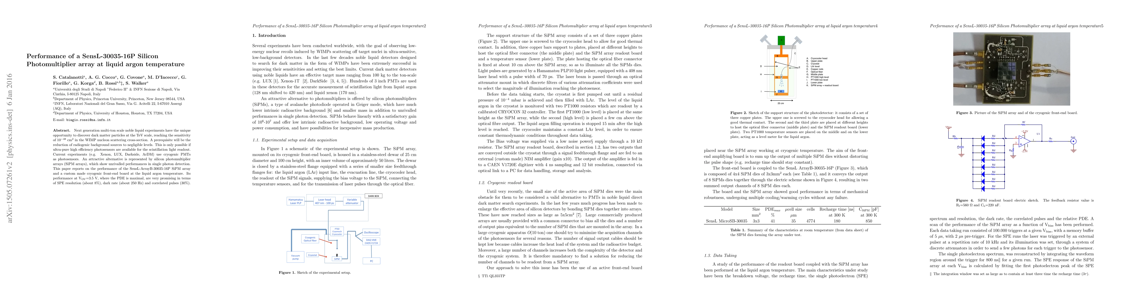 Next generation multi-ton scale noble liquid experiments have the unique opportunity to discover dark matter particles at the TeV scale, reaching the sensitivity of 10^-48 cm2 in the WIMP nucleon scattering cross-section. A prerequisite will be the reduction of radiogenic background sources to negligible levels. This is only possible if ultra pure high efficiency photosensors are available for the scintillation light readout. Current experiments (e.g. Xenon, LUX, Darkside, ArDM) use cryogenic PMTs as photosensors. An attractive alternative is represented by silicon photomultiplier arrays (SiPM arrays), which show unrivalled performances in single photon detection. This paper reports on the performance of the SensL-30035-16P SiPM array and a custom made cryogenic front-end board at the liquid argon temperature.