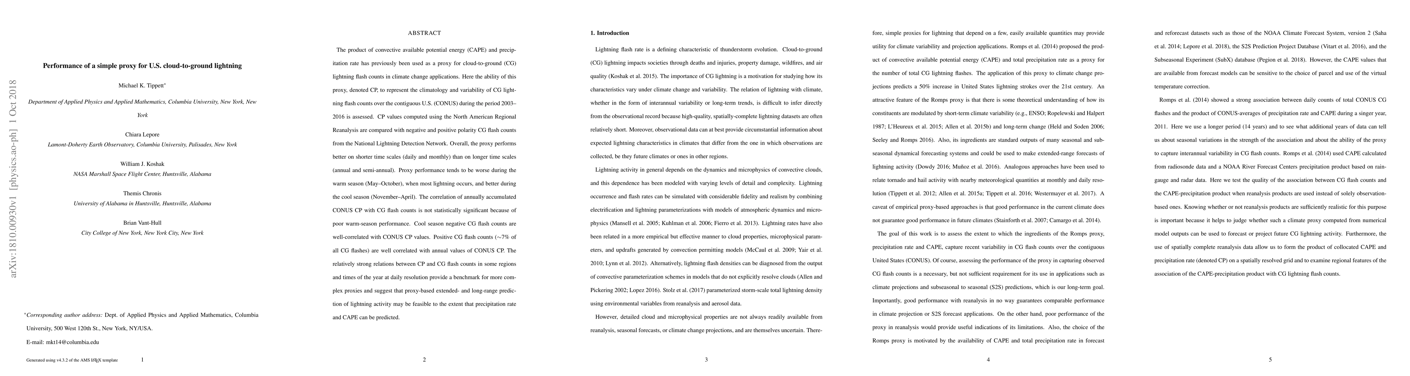 A simple proxy for U.S. cloud-to-ground lightning is compared to actual data from 2003-2016, showing better performance on shorter time scales and worse during the warm season.