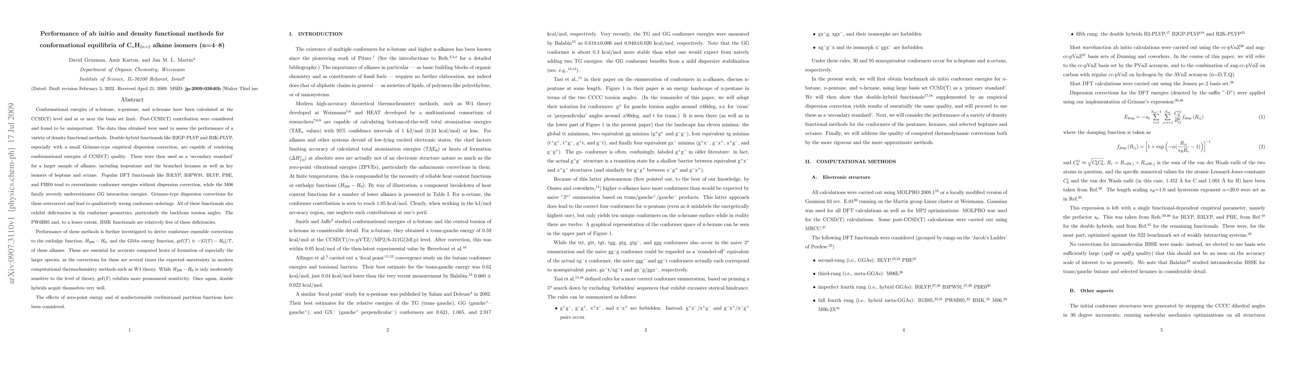 Conformational energies of n-butane, n-pentane, and n-hexane have been calculated at the CCSD(T) level and at or near the basis set limit. Post-CCSD(T) contribution were considered and found to be unimportant. The data thus obtained were used to assess the performance of a variety of density functional methods. Double-hybrid functionals like B2GP-PLYP and B2K-PLYP, especially with a small Grimme-type empirical dispersion correction, are capable of rendering conformational energies of CCSD(T) quality. These were then used as a `secondary standard' for a larger sample of alkanes, including isopentane and the branched hexanes as well as key isomers of heptane and octane. Popular DFT functionals like B3LYP, B3PW91, BLYP, PBE, and PBE0 tend to overestimate conformer energies without dispersion correction, while the M06 family severely underestimates GG interaction energies. Grimme-type dispersion corrections for these overcorrect and lead to qualitatively wrong conformer orderings. All of these functionals also exhibit deficiencies in the conformer geometries, particularly the backbone torsion angles. The PW6B95 and, to a lesser extent, BMK functionals are relatively free of these deficiencies. Performance of these methods is further investigated to derive conformer ensemble corrections to the enthalpy function, $H_{298}-H_0$, and the Gibbs energy function, ${\rm gef}(T)\equiv - [G(T)-H_0]/T$, of these alkanes. While $H_{298}-H_0$ is only moderately sensitive to the level of theory, ${\rm gef}(T)$ exhibits more pronounced sensitivity. Once again, double hybrids acquit themselves very well.