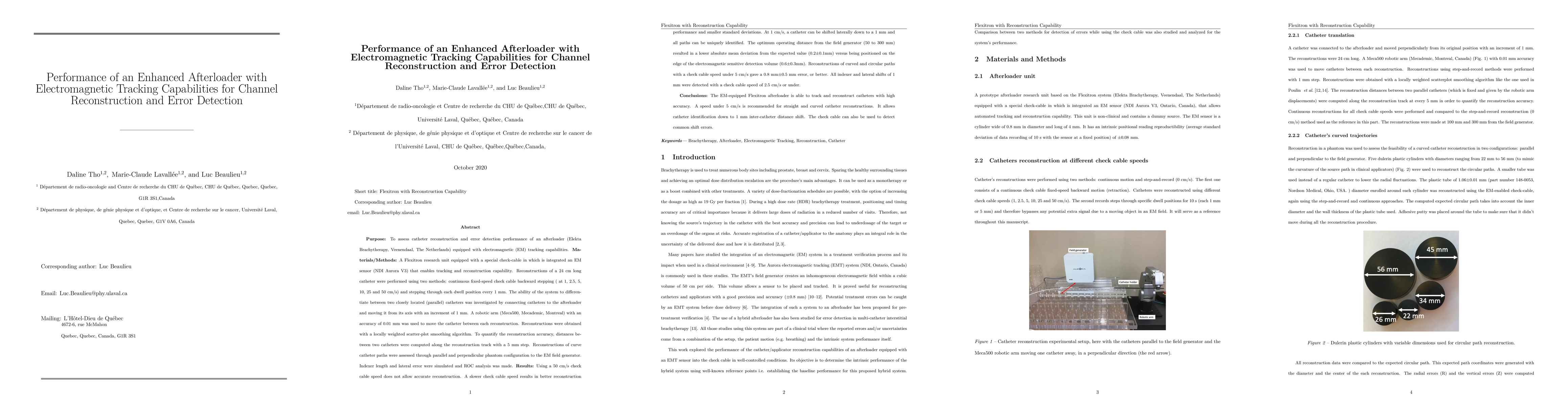 The reconstruction and error detection performance of a Flexitron research unit equipped with a special check-cable in which is integrated an EM sensor (NDI Aurora V3) that enables tracking and reconstruction capability was assessed. Reconstructions of a 24 cm long catheter were performed using two methods: continuous fixed speed check cable backward stepping and stepping through each dwell position every 1mm. The ability of the system to differentiate between two closely located (parallel) catheters was investigated by connecting catheters to the afterloader and moving it from its axis with an increment of 1mm. A robotic arm was used to move the catheter between each reconstruction. Reconstructions were obtained with a locally weighted scatter-plot smoothing algorithm. To quantify the reconstruction accuracy, distances between two catheters were computed along the reconstruction track with a 5mm step. Reconstructions of curve catheter paths were assessed through parallel and perpendicular phantom configuration to the EM field generator. Indexer length and lateral error were simulated and ROC analysis was made. Using a 50cm/s check cable speed does not allow accurate reconstruction. A slower check cable speed results in better reconstruction performance and smaller standard deviations. The optimum operating distance from the field generator (50-300mm) resulted in a lower absolute mean deviation from the expected value (0.2pm0.1mm) versus being positioned on the edge of the electromagnetic sensitive detection volume (0.6pm0.3mm). Reconstructions of curved and circular paths with a check cable speed under 5cm/s gave a 0.8pm0.5mm error, or better. All indexer and lateral shifts of 1mm were detected with a check cable speed of 2.5cm/s or under. A speed under 5cm/s is recommended for straight and curved catheter reconstructions. The check cable can also be used to detect common shift errors.