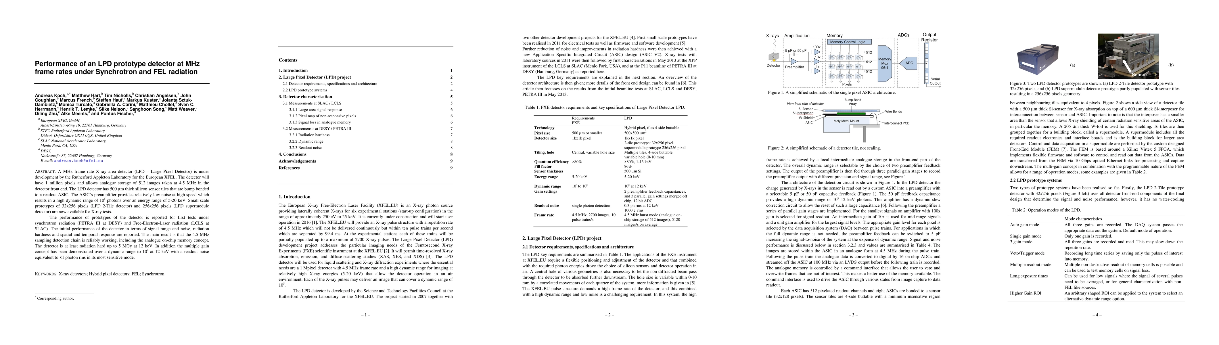 A MHz frame rate X-ray area detector (LPD - Large Pixel Detector) is under development by the Rutherford Appleton Laboratory for the European XFEL. The detector will have 1 million pixels and allows analogue storage of 512 images taken at 4.5 MHz in the detector front end. The LPD detector has 500 mm thick silicon sensor tiles that are bump bonded to a readout ASIC. The ASICs preamplifier provides relatively low noise at high speed which results in a high dynamic range of 10^5 photons over an energy range of 5-20 keV. Small scale prototypes of 32x256 pixels (LPD 2-Tile detector) and 256x256 pixels (LPD supermodule detector) are now available for X-ray tests. The performance of prototypes of the detector is reported for first tests under synchrotron radiation (PETRA III at DESY) and Free-Electron-Laser radiation (LCLS at SLAC). The initial performance of the detector in terms of signal range and noise, radiation hardness and spatial and temporal response are reported. The main result is that the 4.5 MHz sampling detection chain is reliably working, including the analogue on-chip memory concept. The detector is at least radiation hard up to 5 MGy at 12 keV. In addition the multiple gain concept has been demonstrated over a dynamic range to 10^4 at 12 keV with a readout noise equivalent to <1 photon rms in its most sensitive mode.