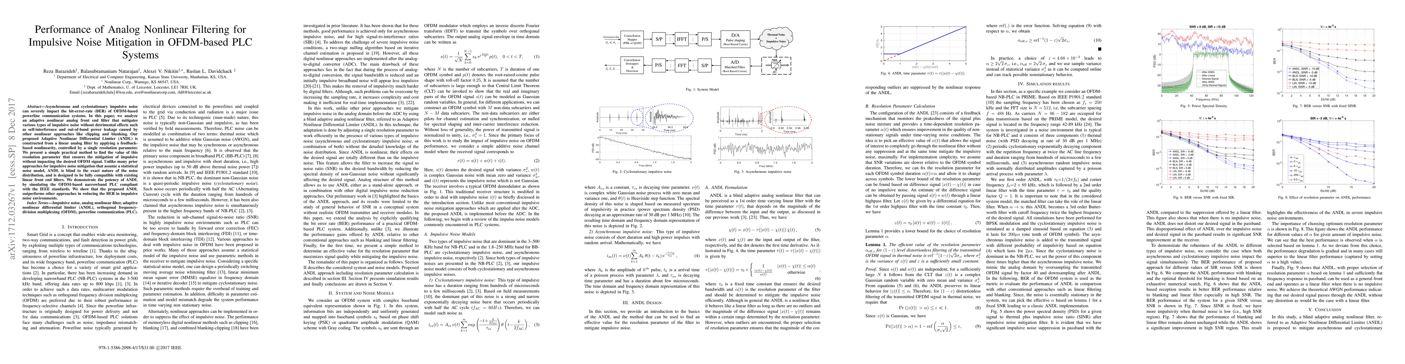 Asynchronous and cyclostationary impulsive noise can severely impact the bit-error-rate (BER) of OFDM-based powerline communication systems. In this paper, we analyze an adaptive nonlinear analog front end filter that mitigates various types of impulsive noise without detrimental effects such as self-interference and out-of-band power leakage caused by other nonlinear approaches like clipping and blanking. Our proposed Adaptive Nonlinear Differential Limiter (ANDL) is constructed from a linear analog filter by applying a feedback-based nonlinearity, controlled by a single resolution parameter. We present a simple practical method to find the value of this resolution parameter that ensures the mitigation of impulsive without impacting the desired OFDM signal. Unlike many prior approaches for impulsive noise mitigation that assume a statistical noise model, ANDL is blind to the exact nature of the noise distribution, and is designed to be fully compatible with existing linear front end filters. We demonstrate the potency of ANDL by simulating the OFDM-based narrowband PLC compliant with the IEEE standards. We show that the proposed ANDL outperforms other approaches in reducing the BER in impulsive noise environments.