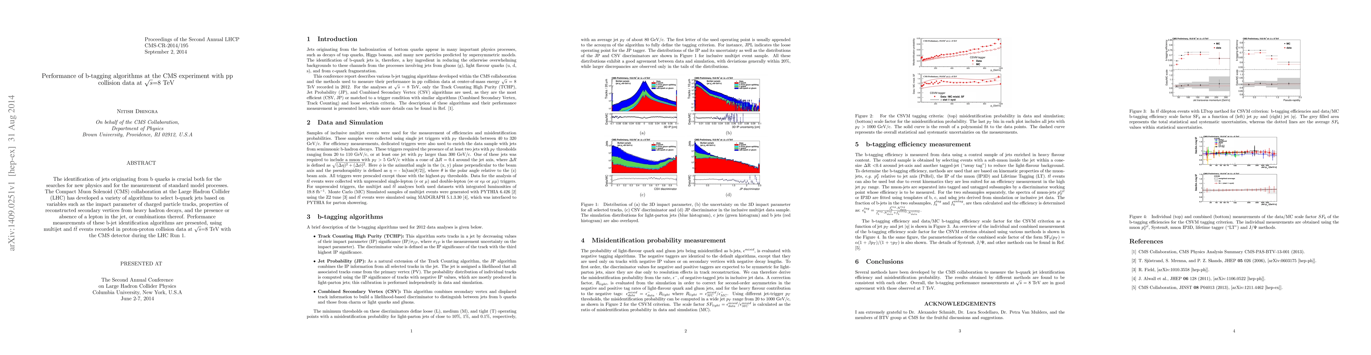 This paper evaluates the performance of b-tagging algorithms developed by the CMS collaboration at the LHC for identifying jets from b-quarks, using data from proton-proton collisions at 8 TeV. The study assesses the effectiveness of these algorithms based on various selection criteria and their application to multijet and $t\overline{t}$ events.