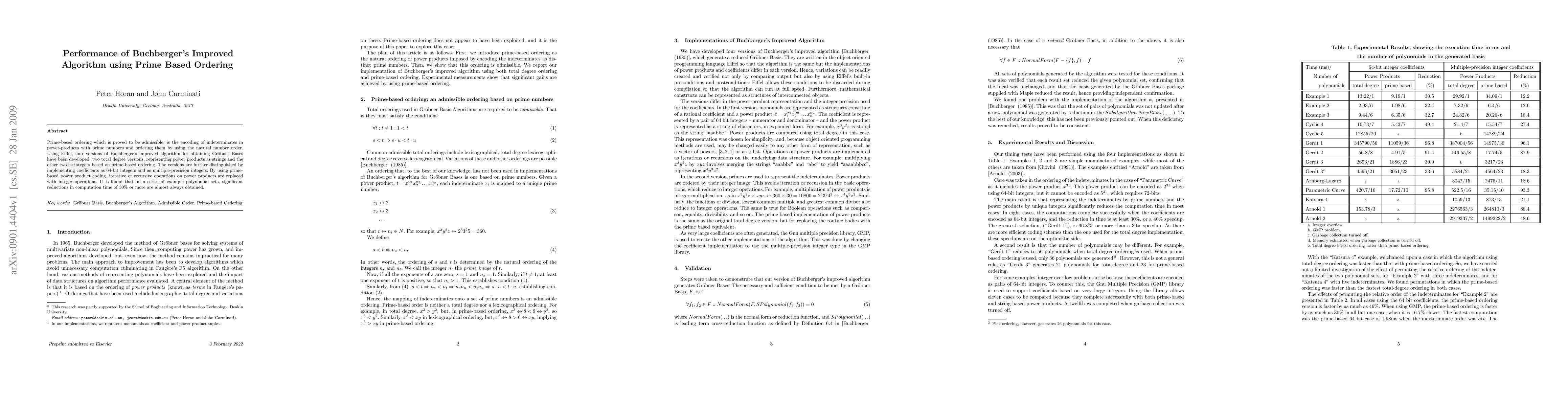 Prime-based ordering which is proved to be admissible, is the encoding of indeterminates in power-products with prime numbers and ordering them by using the natural number order. Using Eiffel, four versions of Buchberger's improved algorithm for obtaining Groebner Bases have been developed: two total degree versions, representing power products as strings and the other two as integers based on prime-based ordering. The versions are further distinguished by implementing coefficients as 64-bit integers and as multiple-precision integers. By using primebased power product coding, iterative or recursive operations on power products are replaced with integer operations. It is found that on a series of example polynomial sets, significant reductions in computation time of 30% or more are almost always obtained.