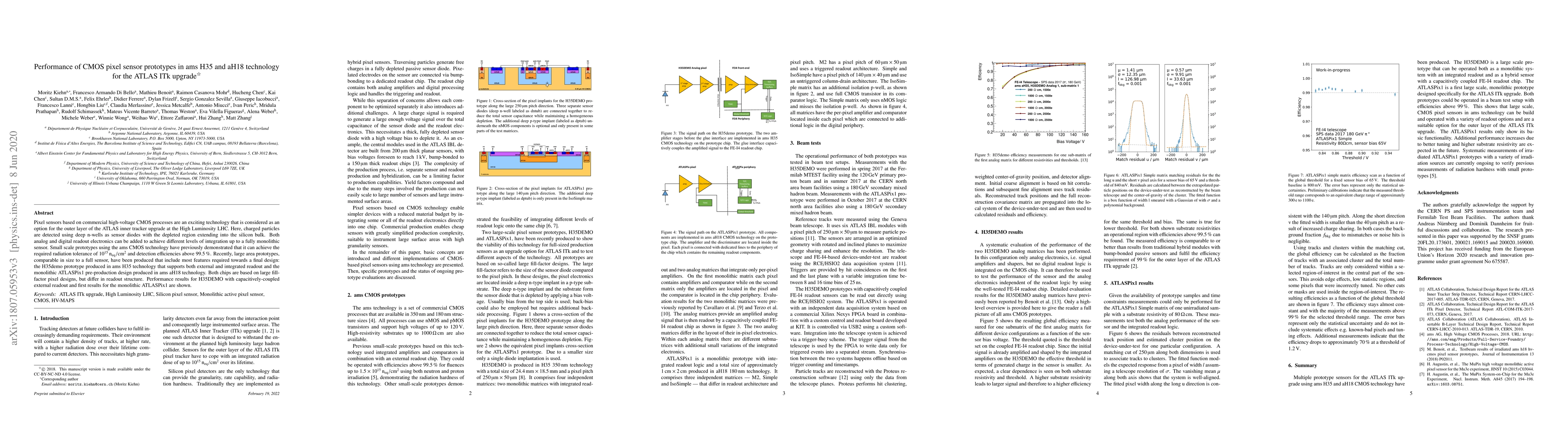 This paper evaluates the performance of CMOS pixel sensor prototypes in ams H35 and aH18 technologies for the ATLAS Inner Tracker upgrade, demonstrating their potential for high radiation tolerance and detection efficiency. The H35DEMO prototype supports both external and integrated readout, while the ATLASPix1 pre-production design in aH18 technology shows promising initial results.