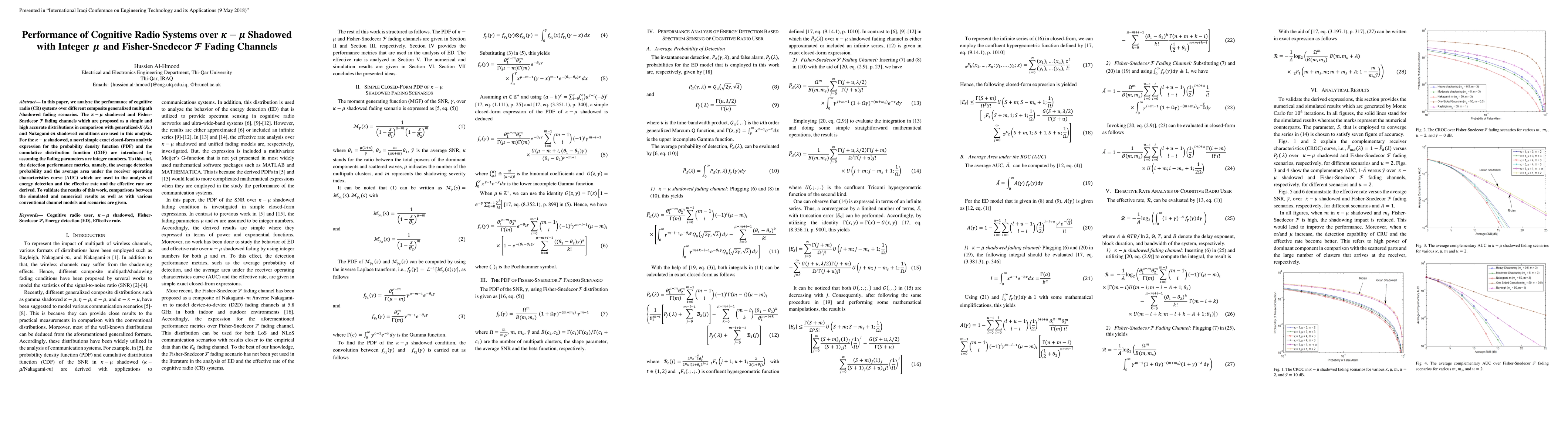 In this paper, we analyze the performance of cognitive radio (CR) systems over different composite generalized multipath /shadowed fading scenarios. The \k{appa}-{\mu} shadowed and Fisher-Snedecor F fading channels which are proposed as a simple and high accurate distributions in comparison with generalized-K (KG) and Nakagami-m shadowed conditions are used in this analysis. For the \k{appa}-{\mu} shadowed, a novel simple exact closed-form analytic expression for the probability density function (PDF) and the cumulative distribution function (CDF) are introduced by assuming the fading parameters are integer numbers. To this end, the detection performance metrics, namely, the average detection probability and the average area under the receiver operating characteristics curve (AUC) which are used in the analysis of energy detection and the effective rate and the effective rate are derived. To validate the results of this work, comparisons between the simulated and numerical results as well as with various conventional channel models and scenarios are given.