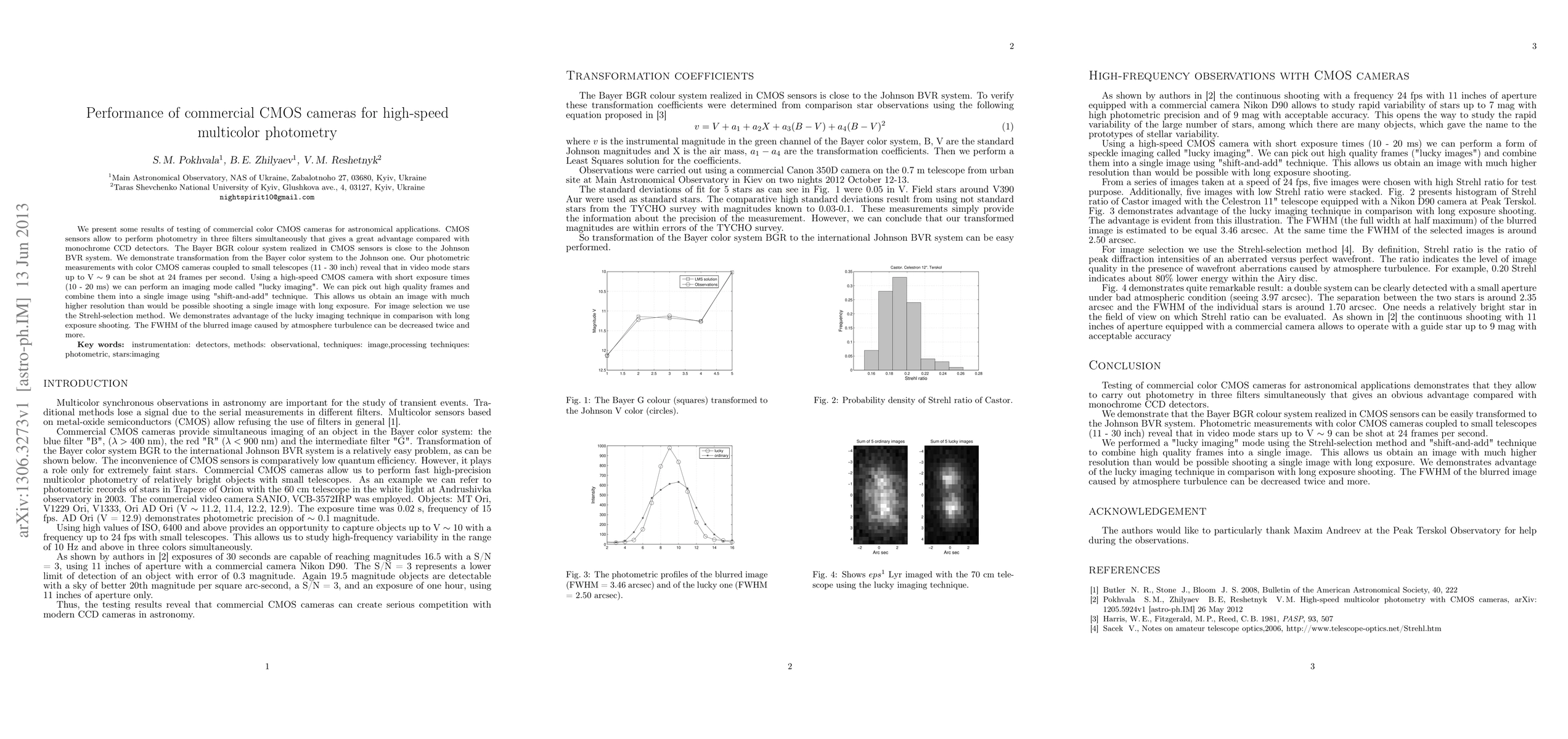 This paper evaluates commercial CMOS cameras for high-speed multicolor photometry in astronomy, showing their capability to perform simultaneous photometry in three filters. The study demonstrates the effectiveness of "lucky imaging" using these cameras, achieving significantly higher resolution compared to traditional long exposure methods.