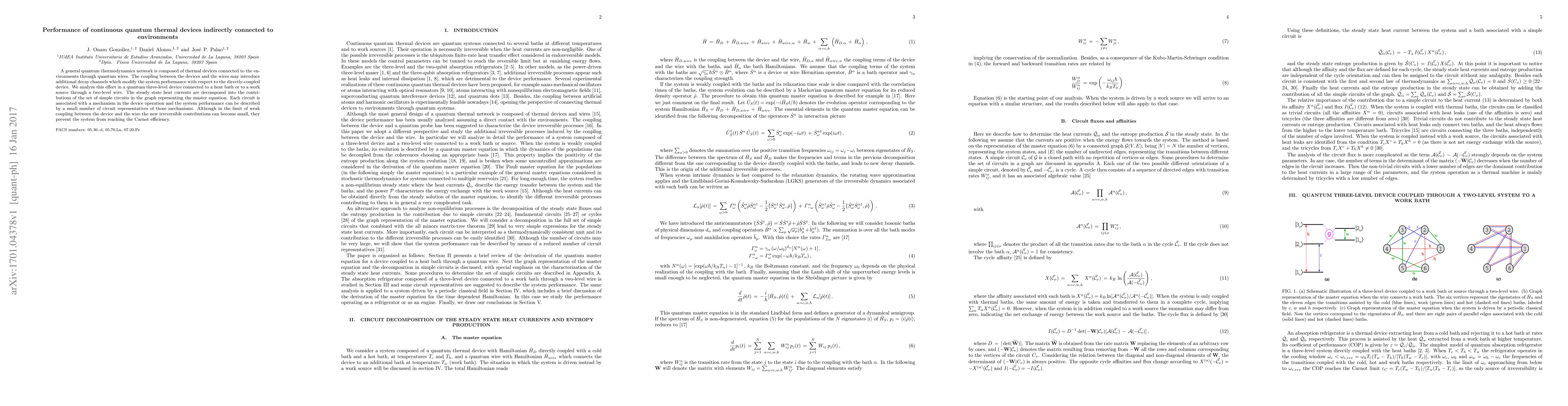 This research analyzes the performance of quantum thermal devices indirectly connected to environments via quantum wires. It finds that such indirect connections introduce additional decay channels, altering device operation and preventing Carnot efficiency, even with weak device-wire coupling. The study decomposes steady-state heat currents into circuit contributions, describing system performance via a few circuit representatives.