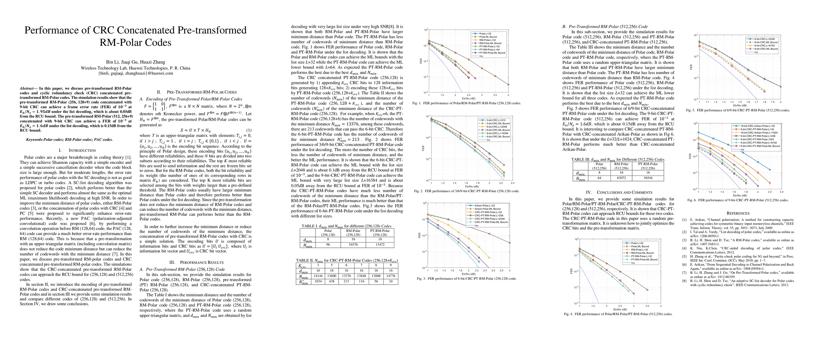 This paper investigates pre-transformed RM-Polar codes concatenated with cyclic redundancy check (CRC) for improved error correction performance. Simulation results demonstrate that these codes achieve low frame error rates near the RCU bound, with the (256, 128+9) code at 0.001 FER at Eb/No=1.95dB and the (512, 256+9) code at 0.001 FER at Eb/No=1.6dB.