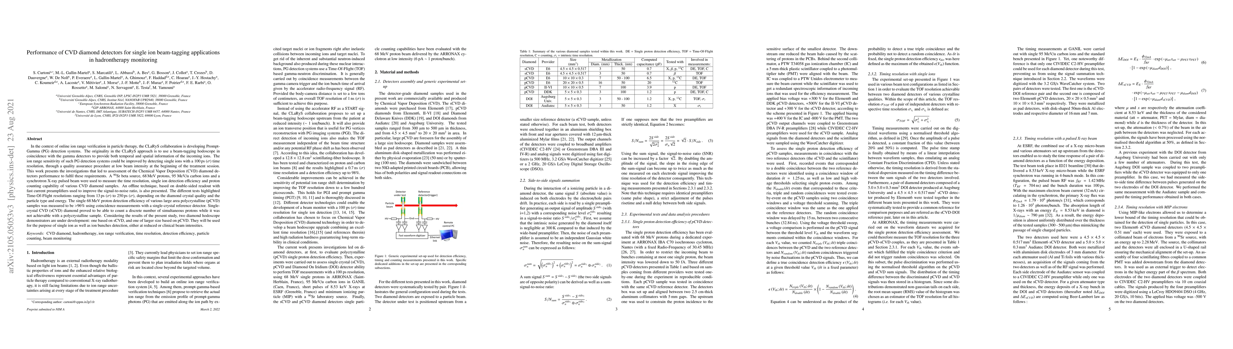 In the context of online ion range verification in particle therapy, the CLaRyS collaboration is developing Prompt-Gamma (PG) detection systems. The originality in the CLaRyS approach is to use a beam-tagging hodoscope in coincidence with the gamma detectors to provide both temporal and spatial information of the incoming ions. The ion range sensitivity of such PG detection systems could be improved by detecting single ions with a 100 ps ($\sigma$) time resolution, through a quality assurance procedure at low beam intensity at the beginning of the treatment session. This work presents the investigations led to assess the performance of Chemical Vapor Deposition (CVD) diamond detectors to fulfill these requirements. A $^{90}$Sr beta source, 68 MeV protons, 95 MeV/u carbon ions and a synchrotron X-ray pulsed beam were used to measure the time resolution, single ion detection efficiency and proton counting capability of various CVD diamond samples. An offline technique, based on double-sided readout with fast current preamplifiers and used to improve the signal-to-noise ratio, is also presented. The different tests highlighted Time-Of-Flight resolutions ranging from 13 ps ($\sigma$) to 250 ps ($\sigma$), depending on the experimental conditions. The single 68 MeV proton detection efficiency of various large area polycrystalline (pCVD) samples was measured to be $>$96% using coincidence measurements with a single-crystal reference detector. Single-crystal CVD (sCVD) diamond proved to be able to count a discrete number of simultaneous protons while it was not achievable with a polycrystalline sample. Considering the results of the present study, two diamond hodoscope demonstrators are under development: one based on sCVD, and one of larger size based on pCVD. They will be used for the purpose of single ion as well as ion bunches detection, either at reduced or clinical beam intensities.