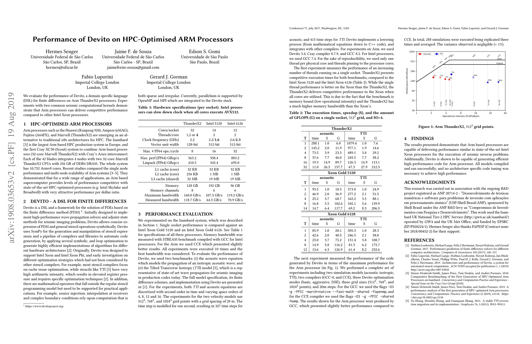 We evaluate the performance of Devito, a domain specific language (DSL) for finite differences on Arm ThunderX2 processors. Experiments with two common seismic computational kernels demonstrate that Arm processors can deliver competitive performance compared to other Intel Xeon processors.