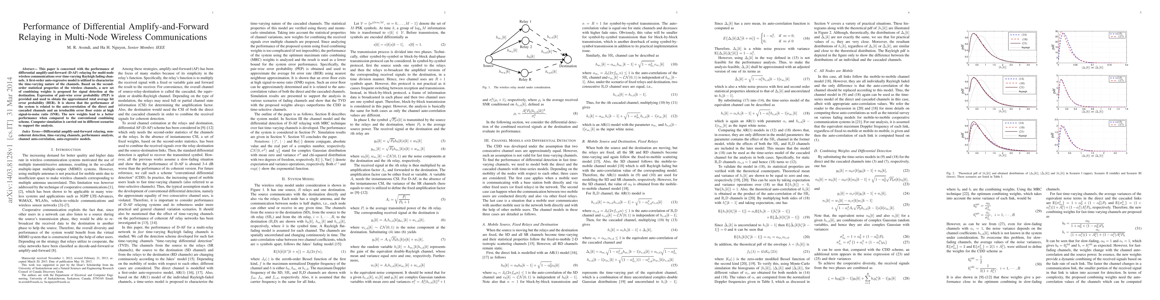 This paper evaluates the performance of differential amplify-and-forward relaying in multi-node wireless communications over time-varying Rayleigh fading channels, proposing new combining weights that improve signal detection and reduce error floors compared to conventional methods. Simulation results validate the theoretical analysis.