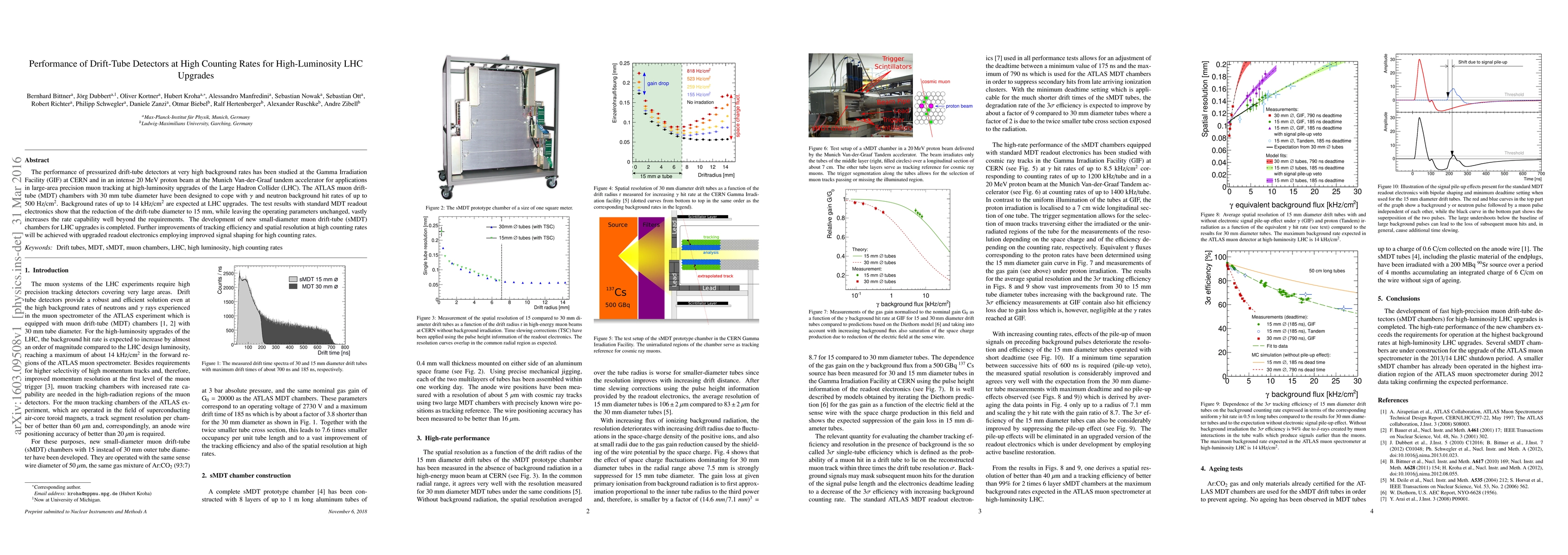 The performance of pressurized drift-tube detectors at very high background rates has been studied at the Gamma Irradiation Facility (GIF) at CERN and in an intense 20 MeV proton beam at the Munich Van-der-Graaf tandem accelerator for applications in large-area precision muon tracking at high-luminosity upgrades of the Large Hadron Collider (LHC). The ATLAS muon drifttube (MDT) chambers with 30 mm tube diameter have been designed to cope with and neutron background hit rates of up to 500 Hz/square cm. Background rates of up to 14 kHz/square cm are expected at LHC upgrades. The test results with standard MDT readout electronics show that the reduction of the drift-tube diameter to 15 mm, while leaving the operating parameters unchanged, vastly increases the rate capability well beyond the requirements. The development of new small-diameter muon drift-tube (sMDT) chambers for LHC upgrades is completed. Further improvements of tracking efficiency and spatial resolution at high counting rates will be achieved with upgraded readout electronics employing improved signal shaping for high counting rates.