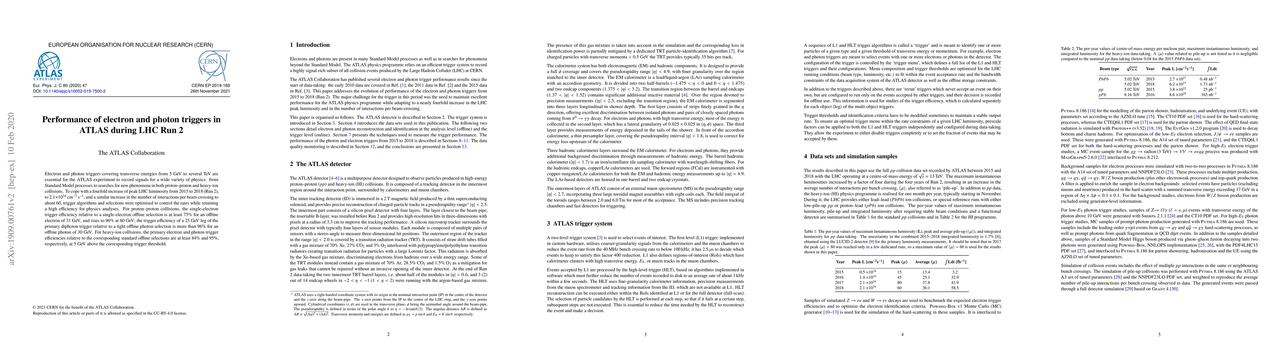 This paper evaluates the performance of electron and photon triggers in ATLAS during LHC Run 2, optimizing algorithms to handle increased luminosity and interaction rates while maintaining high trigger efficiencies: 75%-96% for electrons and over 96% for photons in proton-proton collisions, and at least 84% for electrons and 95% for photons in heavy-ion collisions.