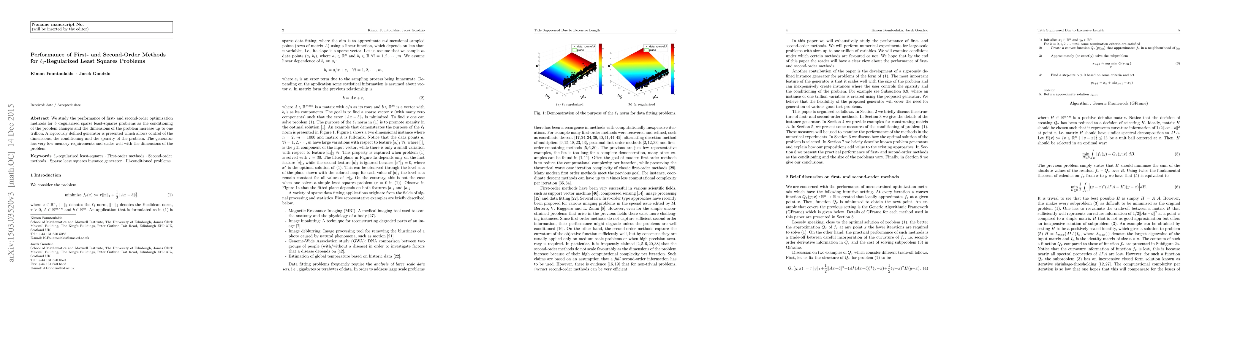 This paper evaluates first- and second-order optimization methods for l1-regularized sparse least-squares problems under varying dimensions and conditioning, up to one trillion. A low-memory, scalable problem generator is introduced to control problem dimensions, conditioning, and sparsity.
