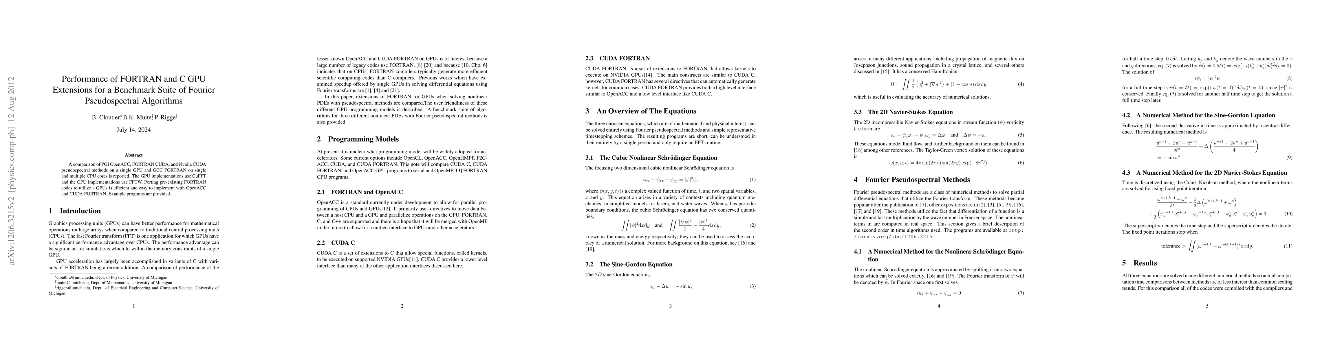 Summary: This study compares the performance of GPU extensions for FORTRAN and C in implementing Fourier pseudospectral algorithms, finding that OpenACC and CUDA FORTRAN provide efficient GPU utilization, while GCC FORTRAN on CPUs is effective for parallel processing across multiple cores. Example programs demonstrate the ease of porting existing FORTRAN codes to GPUs.