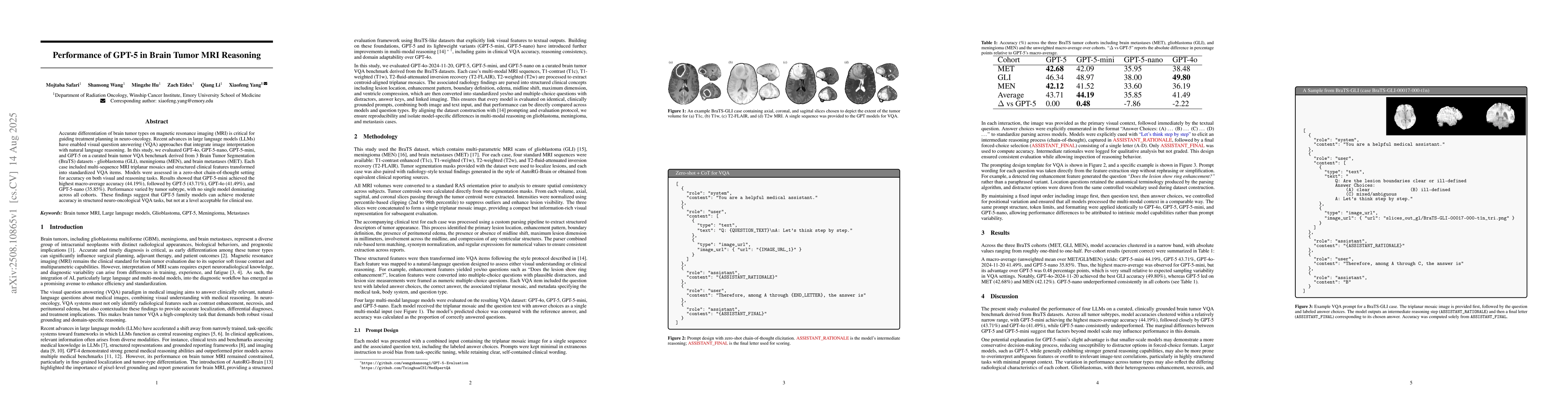 Accurate differentiation of brain tumor types on magnetic resonance imaging (MRI) is critical for guiding treatment planning in neuro-oncology. Recent advances in large language models (LLMs) have enabled visual question answering (VQA) approaches that integrate image interpretation with natural language reasoning. In this study, we evaluated GPT-4o, GPT-5-nano, GPT-5-mini, and GPT-5 on a curated brain tumor VQA benchmark derived from 3 Brain Tumor Segmentation (BraTS) datasets - glioblastoma (GLI), meningioma (MEN), and brain metastases (MET). Each case included multi-sequence MRI triplanar mosaics and structured clinical features transformed into standardized VQA items. Models were assessed in a zero-shot chain-of-thought setting for accuracy on both visual and reasoning tasks. Results showed that GPT-5-mini achieved the highest macro-average accuracy (44.19%), followed by GPT-5 (43.71%), GPT-4o (41.49%), and GPT-5-nano (35.85%). Performance varied by tumor subtype, with no single model dominating across all cohorts. These findings suggest that GPT-5 family models can achieve moderate accuracy in structured neuro-oncological VQA tasks, but not at a level acceptable for clinical use.