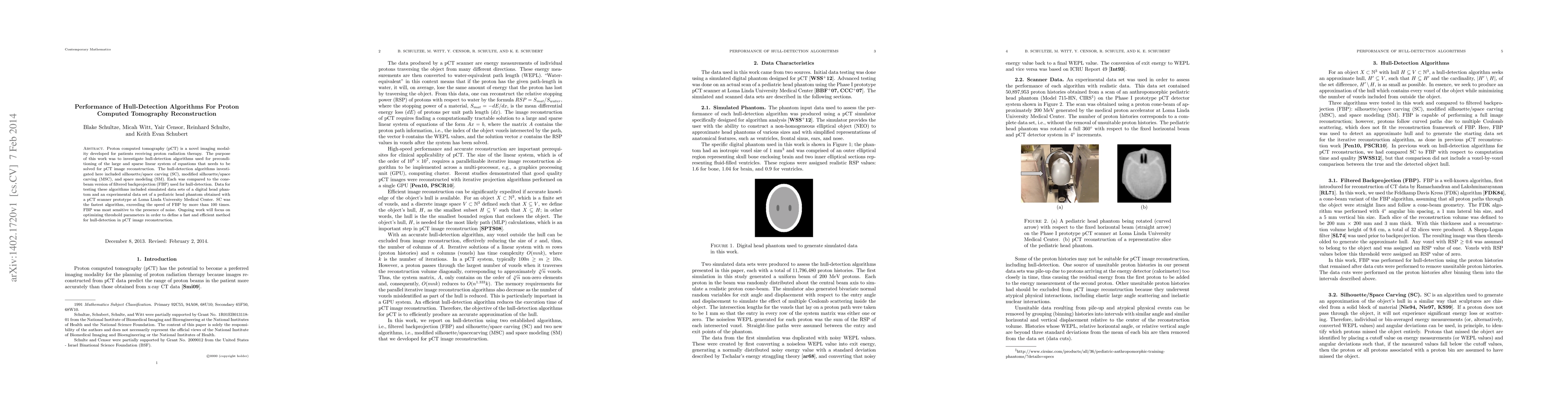 This study evaluates hull-detection algorithms for proton computed tomography (pCT) reconstruction, comparing silhouette/space carving (SC), modified silhouette/space carving (MSC), and space modeling (SM) to cone-beam filtered backprojection (FBP). SC was found to be significantly faster than FBP, while FBP was more sensitive to noise; ongoing research aims to optimize threshold parameters for efficient hull-detection.