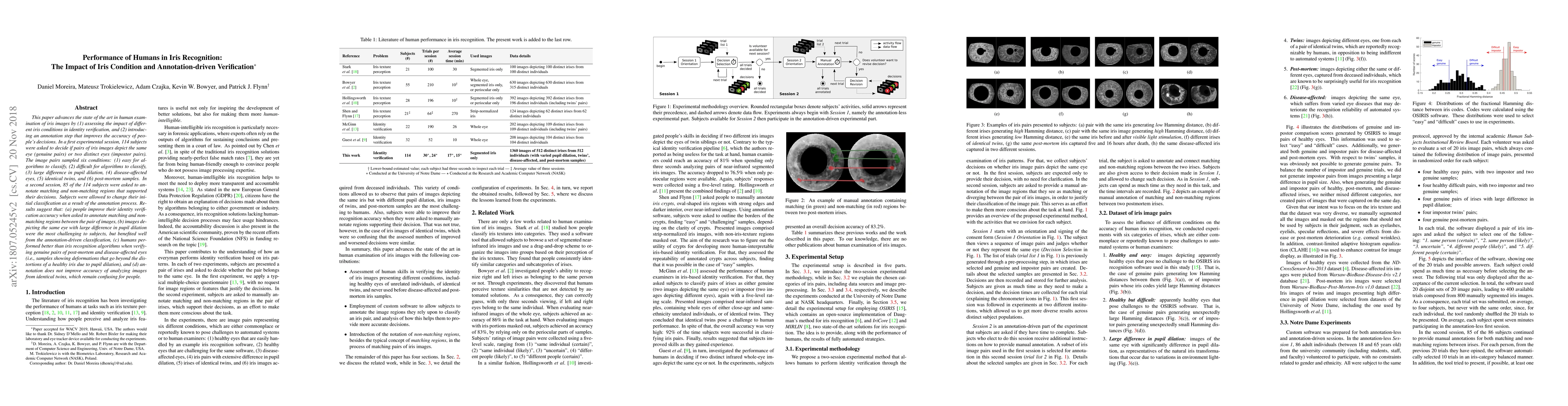 This study evaluates human performance in iris recognition under various iris conditions and introduces an annotation-driven verification method. Results show that annotation improves accuracy, especially for challenging conditions like pupil dilation differences, while identical twins remain difficult for both humans and algorithms.