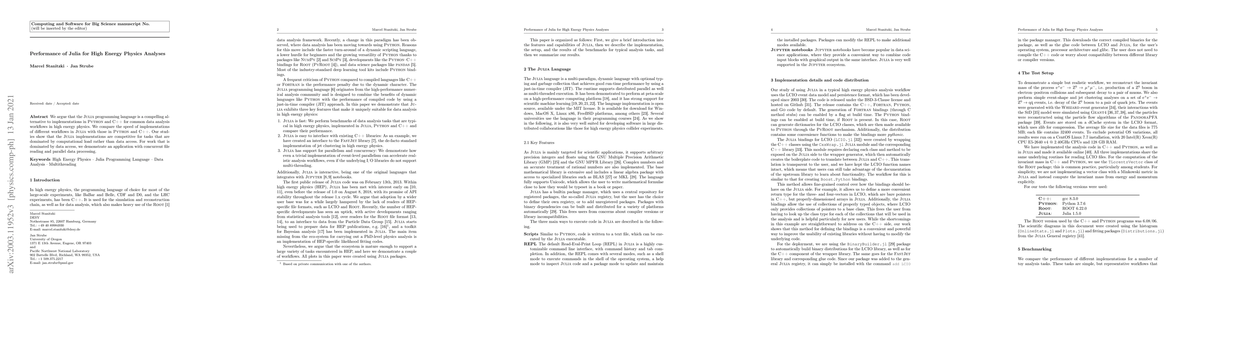 The Julia programming language is shown to be competitive with Python and C++ for high energy physics data analysis, especially for computationally intensive tasks. For data-heavy tasks involving concurrent file reading and parallel processing, Julia's performance is highlighted.