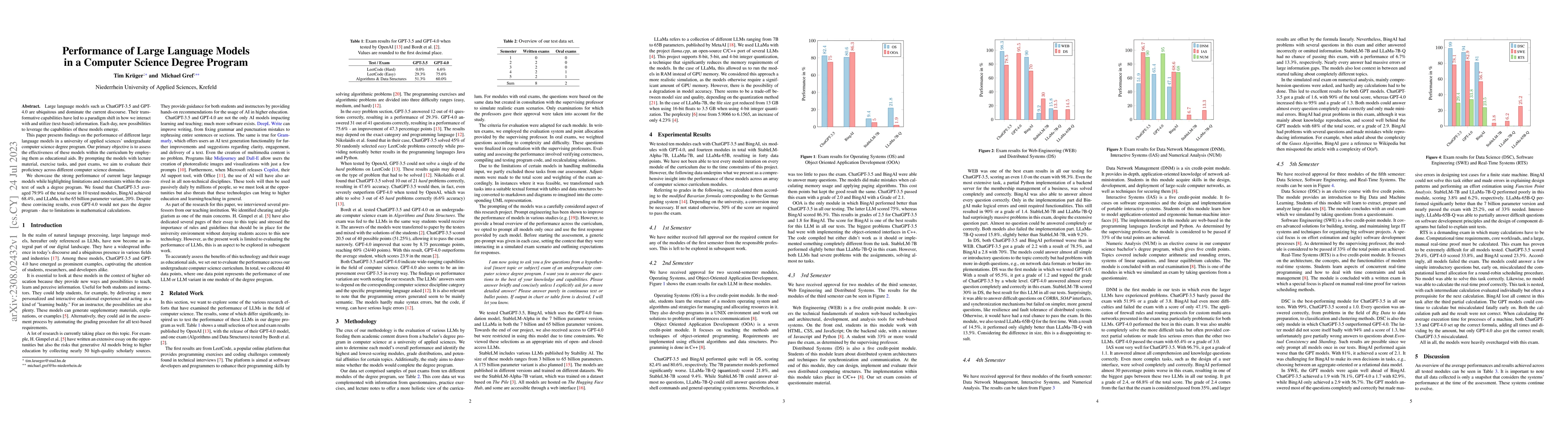 Large language models such as ChatGPT-3.5 and GPT-4.0 are ubiquitous and dominate the current discourse. Their transformative capabilities have led to a paradigm shift in how we interact with and utilize (text-based) information. Each day, new possibilities to leverage the capabilities of these models emerge. This paper presents findings on the performance of different large language models in a university of applied sciences' undergraduate computer science degree program. Our primary objective is to assess the effectiveness of these models within the curriculum by employing them as educational aids. By prompting the models with lecture material, exercise tasks, and past exams, we aim to evaluate their proficiency across different computer science domains. We showcase the strong performance of current large language models while highlighting limitations and constraints within the context of such a degree program. We found that ChatGPT-3.5 averaged 79.9% of the total score in 10 tested modules, BingAI achieved 68.4%, and LLaMa, in the 65 billion parameter variant, 20%. Despite these convincing results, even GPT-4.0 would not pass the degree program - due to limitations in mathematical calculations.