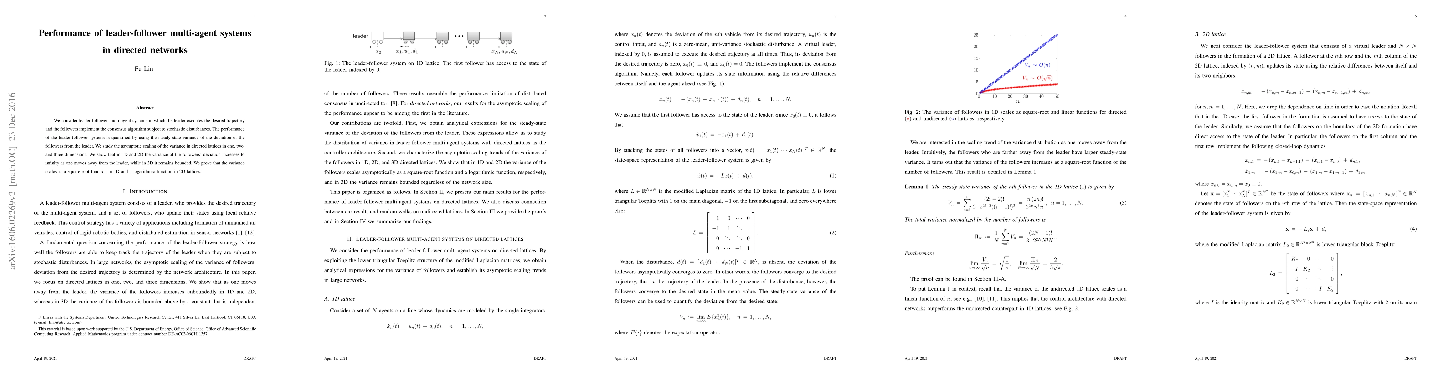 This paper investigates leader-follower multi-agent systems in directed networks, focusing on the steady-state variance of followers' deviation from the leader. It finds that in 1D and 2D lattices, variance increases indefinitely with distance, while in 3D it remains bounded, showing a square-root and logarithmic scaling respectively.