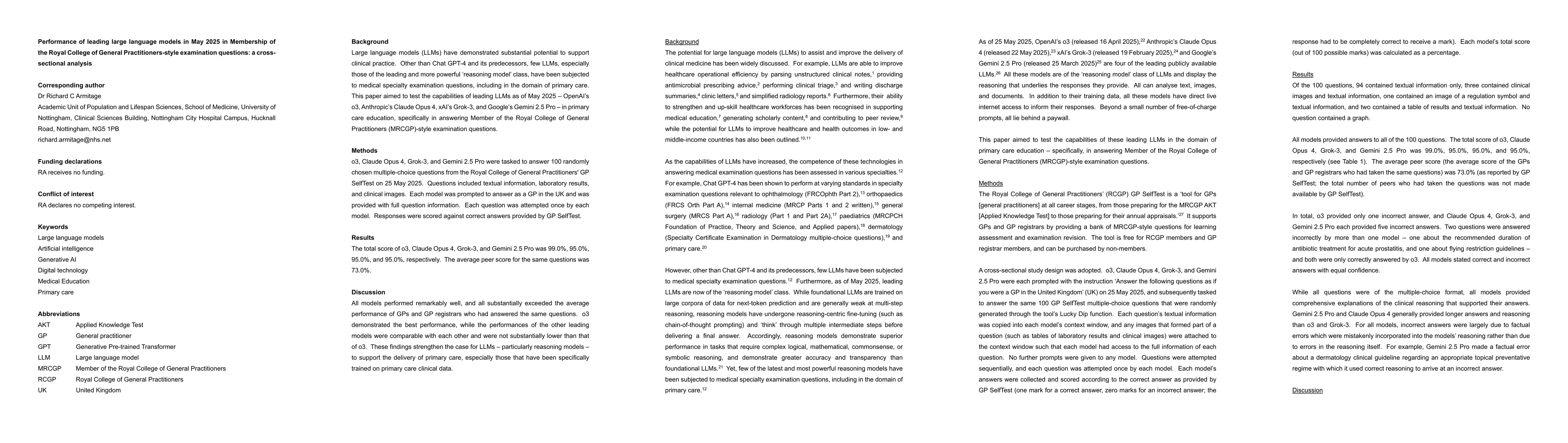 Demonstrated high accuracy of leading LLMs in answering MRCGP-style examination questions, highlighting their potential in primary care support.