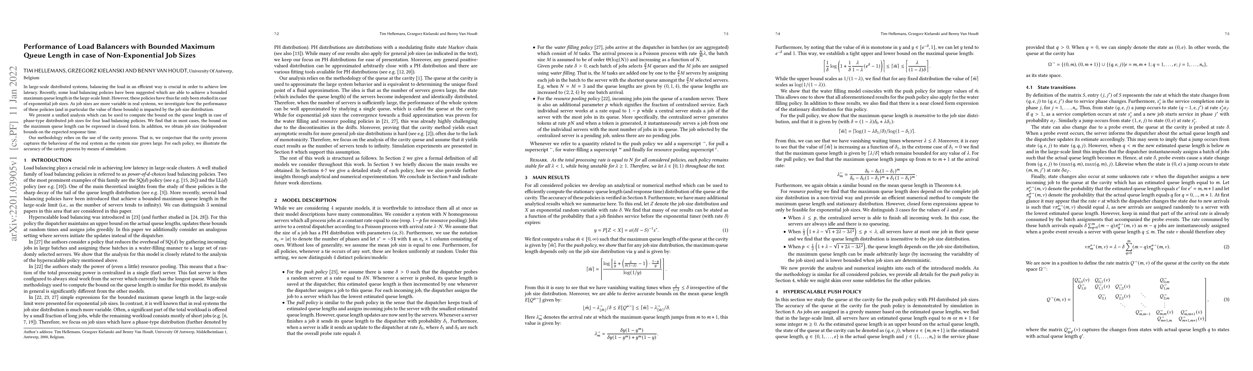 In large-scale distributed systems, balancing the load in an efficient way is crucial in order to achieve low latency. Recently, some load balancing policies have been suggested which are able to achieve a bounded maximum queue length in the large-scale limit. However, these policies have thus far only been studied in case of exponential job sizes. As job sizes are more variable in real systems, we investigate how the performance of these policies (and in particular the value of these bounds) is impacted by the job size distribution. We present a unified analysis which can be used to compute the bound on the queue length in case of phase-type distributed job sizes for four load balancing policies. We find that in most cases, the bound on the maximum queue length can be expressed in closed form. In addition, we obtain job size (in)dependent bounds on the expected response time. Our methodology relies on the use of the cavity process. That is, we conjecture that the cavity process captures the behaviour of the real system as the system size grows large. For each policy, we illustrate the accuracy of the cavity process by means of simulation.