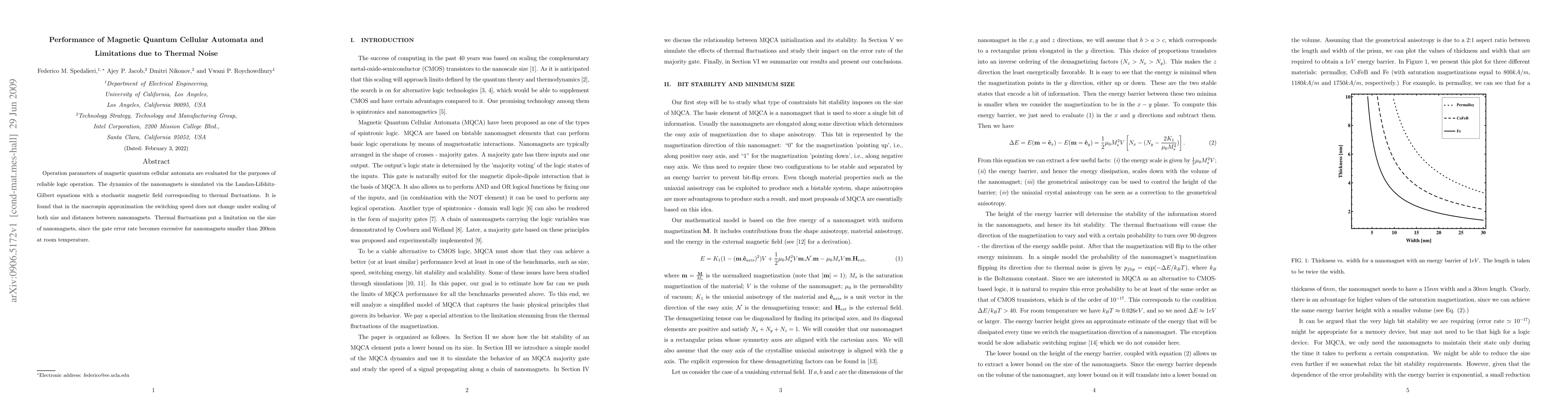Operation parameters of magnetic quantum cellular automata are evaluated for the purposes of reliable logic operation. The dynamics of the nanomagnets is simulated via the Landau-Lifshitz-Gilbert equations with a stochastic magnetic field corresponding to thermal fluctuations. It is found that in the macrospin approximation the switching speed does not change under scaling of both size and distances between nanomagnets. Thermal fluctuations put a limitation on the size of nanomagnets, since the gate error rate becomes excessive for nanomagnets smaller than 200nm at room temperature.