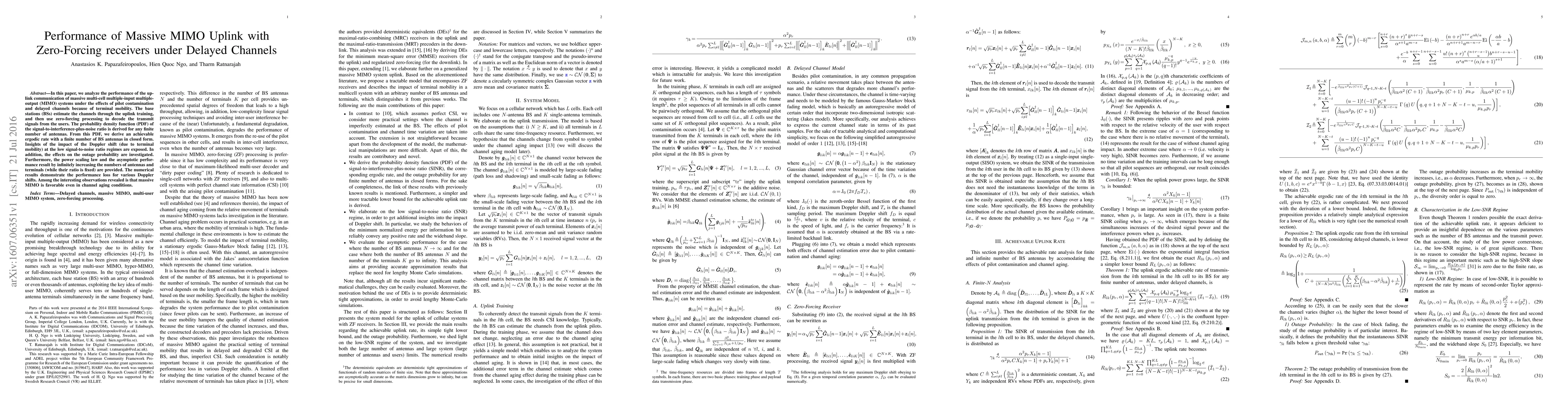 In this paper, we analyze the performance of the uplink communication of massive multi-cell multiple-input multiple-output (MIMO) systems under the effects of pilot contamination and delayed channels because of terminal mobility. The base stations (BSs) estimate the channels through the uplink training, and then use zero-forcing processing to decode the transmit signals from the users. The probability density function (PDF) of the signal-to-interference-plus-noise ratio is derived for any finite number of antennas. From this PDF, we derive an achievable ergodic rate with a finite number of BS antennas in closed form. Insights of the impact of the Doppler shift (due to terminal mobility) at the low signal-to-noise ratio regimes are exposed. In addition, the effects on the outage probability are investigated. Furthermore, the power scaling law and the asymptotic performance result by infinitely increasing the numbers of antennas and terminals (while their ratio is fixed) are provided. The numerical results demonstrate the performance loss for various Doppler shifts. Among the interesting observations revealed is that massive MIMO is favorable even in channel aging conditions.