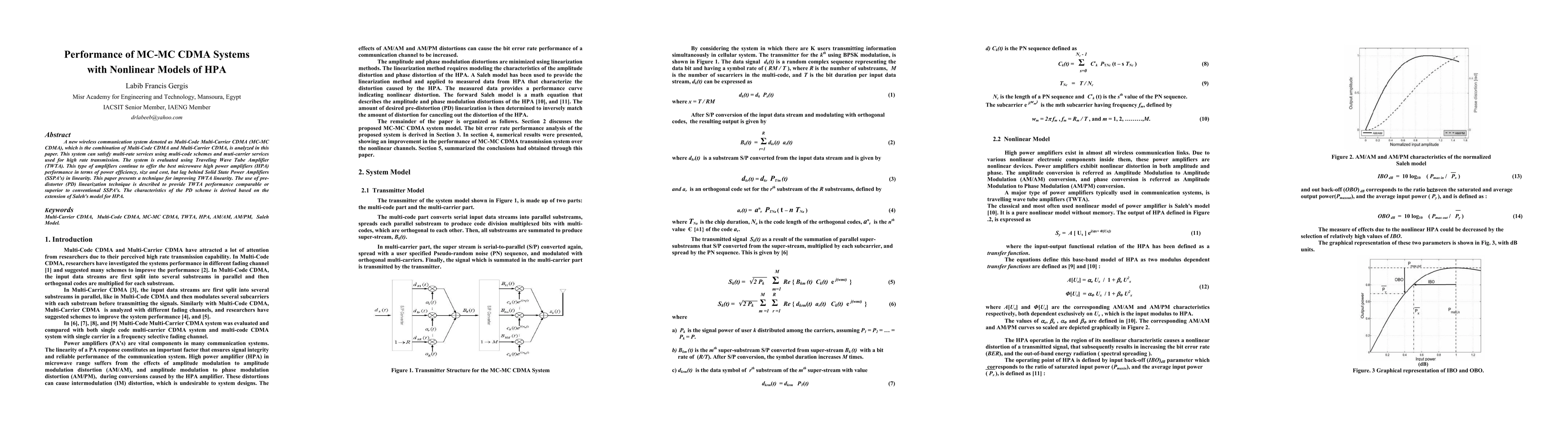 A new wireless communication system denoted as Multi-Code Multi-Carrier CDMA (MC-MC CDMA), which is the combination of Multi-Code CDMA and Multi-Carrier CDMA, is analyzed in this paper. This system can satisfy multi-rate services using multi-code schemes and muti-carrier services used for high rate transmission. The system is evaluated using Traveling Wave Tube Amplifier (TWTA). This type of amplifiers continue to offer the best microwave high power amplifiers (HPA) performance in terms of power efficiency, size and cost, but lag behind Solid State Power Amplifiers (SSPA's) in linearity. This paper presents a technique for improving TWTA linearity. The use of predistorter (PD) linearization technique is described to provide TWTA performance comparable or superior to conventional SSPA's. The characteristics of the PD scheme is derived based on the extension of Saleh's model for HPA.