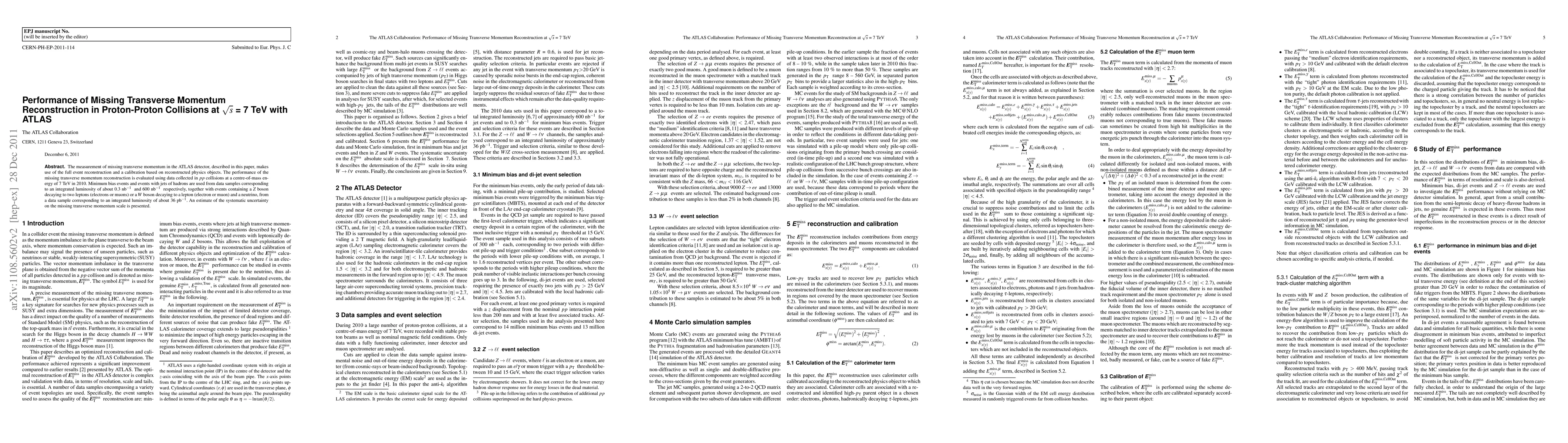 This study measures missing transverse momentum in proton-proton collisions at 7 TeV using ATLAS data, evaluating its performance with various event types and estimating systematic uncertainty.
