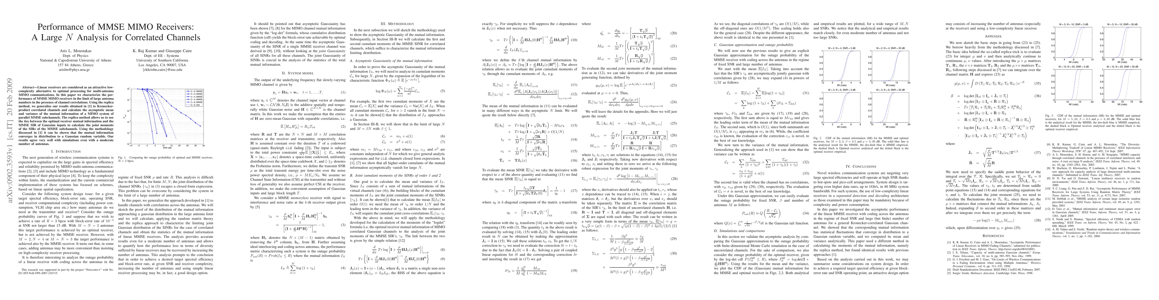 This paper analyzes the performance of MMSE MIMO receivers in large antenna scenarios with correlated channels, using the replica method to derive asymptotic mean and variance of mutual information. The results show mutual information converges to a Gaussian distribution, aligning closely with simulations.
