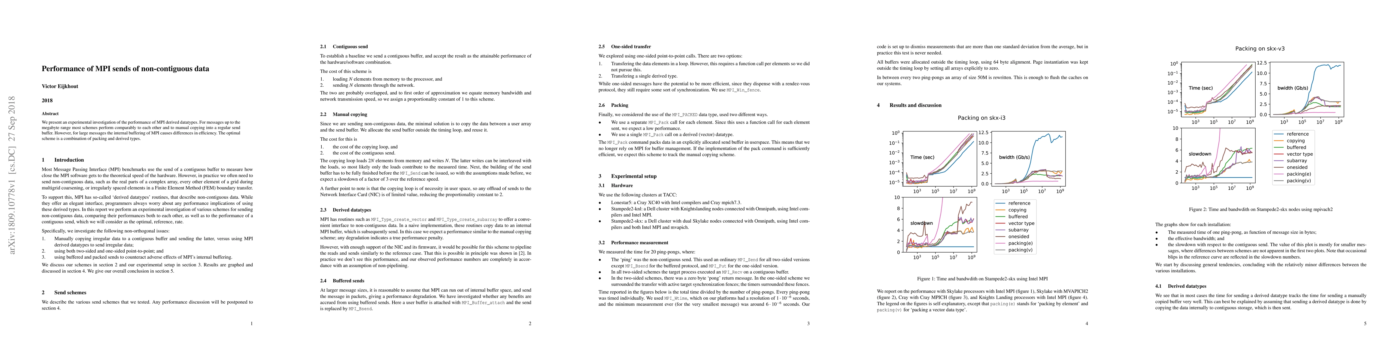 This study experimentally investigates the performance of MPI sends for non-contiguous data, finding that most schemes perform similarly for small messages but differ significantly for large messages due to MPI's internal buffering. The best approach combines packing with derived types for optimal efficiency.