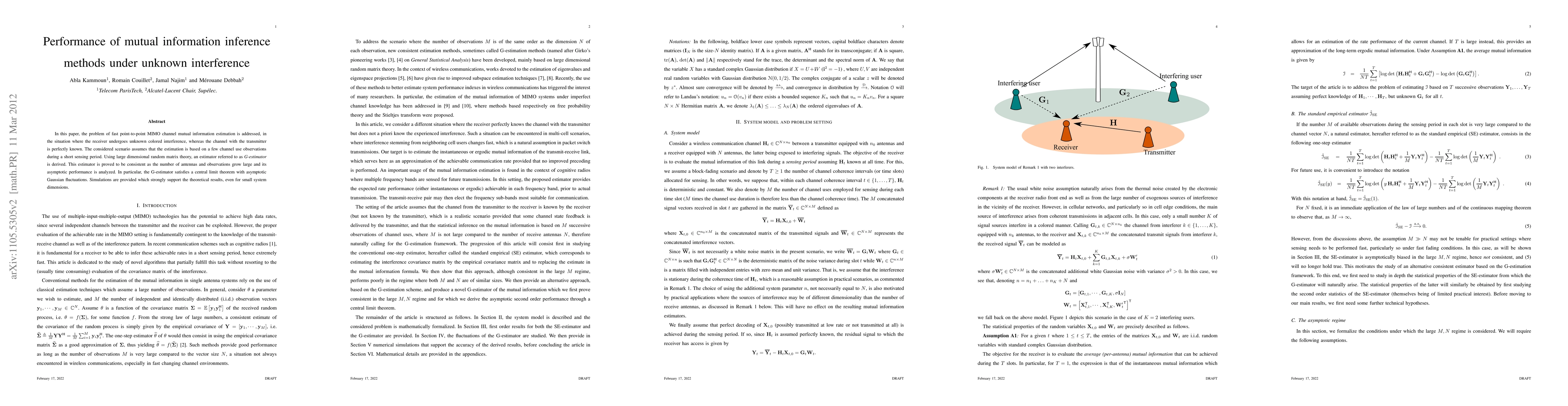 The problem of fast point-to-point MIMO channel mutual information estimation is addressed, in the situation where the receiver undergoes unknown colored interference, whereas the channel with the transmitter is perfectly known. The considered scenario assumes that the estimation is based on a few channel use observations during a short sensing period. Using large dimensional random matrix theory, an estimator referred to as {\em G-estimator} is derived. This estimator is proved to be consistent as the number of antennas and observations grow large and its asymptotic performance is analyzed. In particular, the G-estimator satisfies a central limit theorem with asymptotic Gaussian fluctuations. Simulations are provided which strongly support the theoretical results, even for small system dimensions.