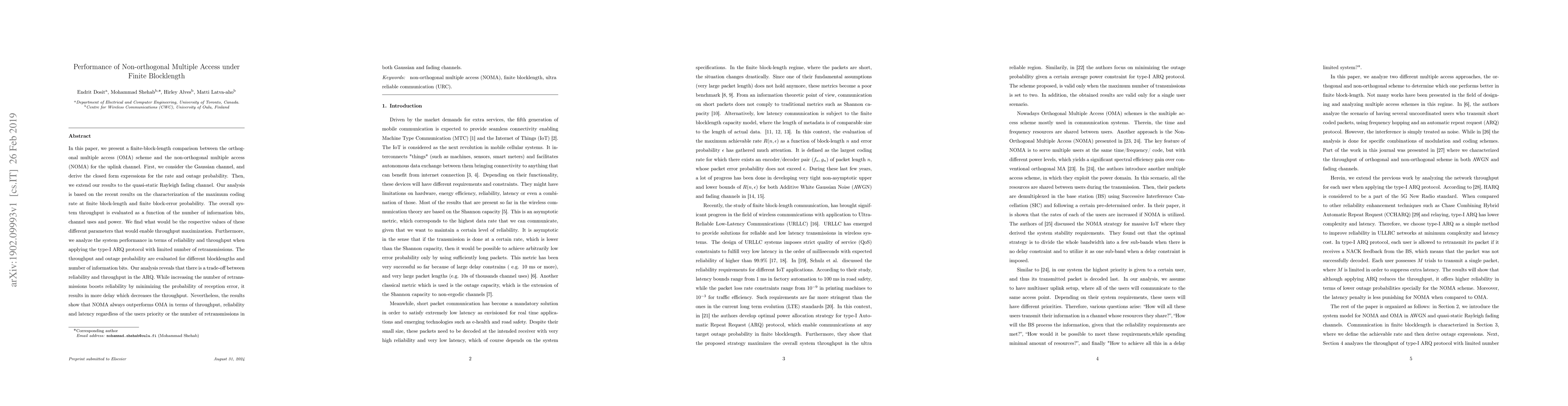 This paper compares the performance of orthogonal multiple access (OMA) and non-orthogonal multiple access (NOMA) under finite blocklength conditions, finding that NOMA consistently outperforms OMA in terms of throughput, reliability, and latency across Gaussian and Rayleigh fading channels. The analysis also reveals a trade-off between reliability and throughput in the context of ARQ protocols.