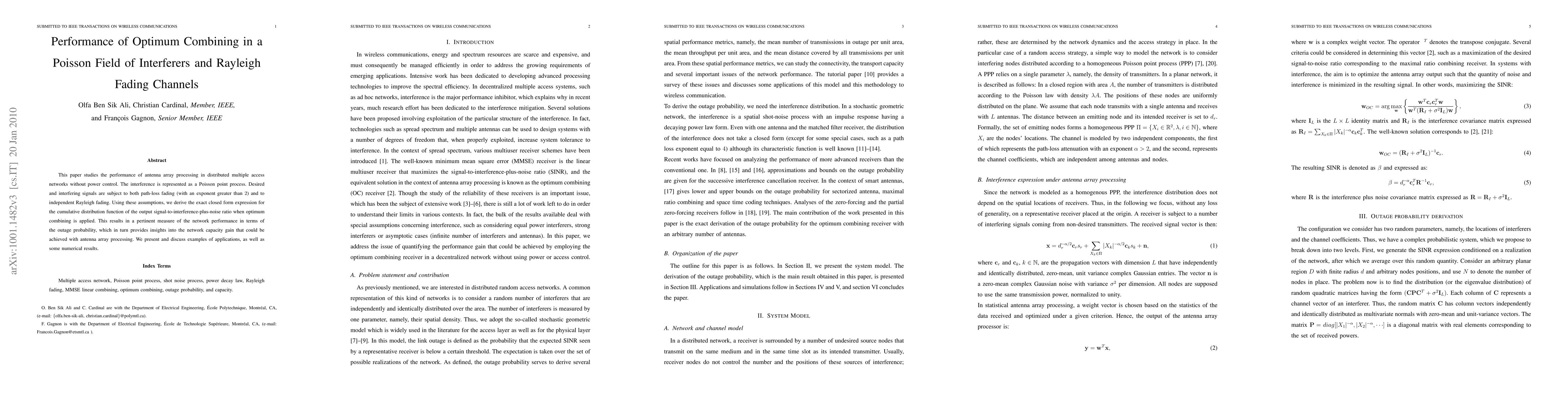 This paper derives an exact closed-form expression for the cumulative distribution of the signal-to-interference-plus-noise ratio in antenna array processing for multiple access networks with Rayleigh fading and Poisson interferers. The study provides insights into network performance and capacity gains through outage probability analysis.