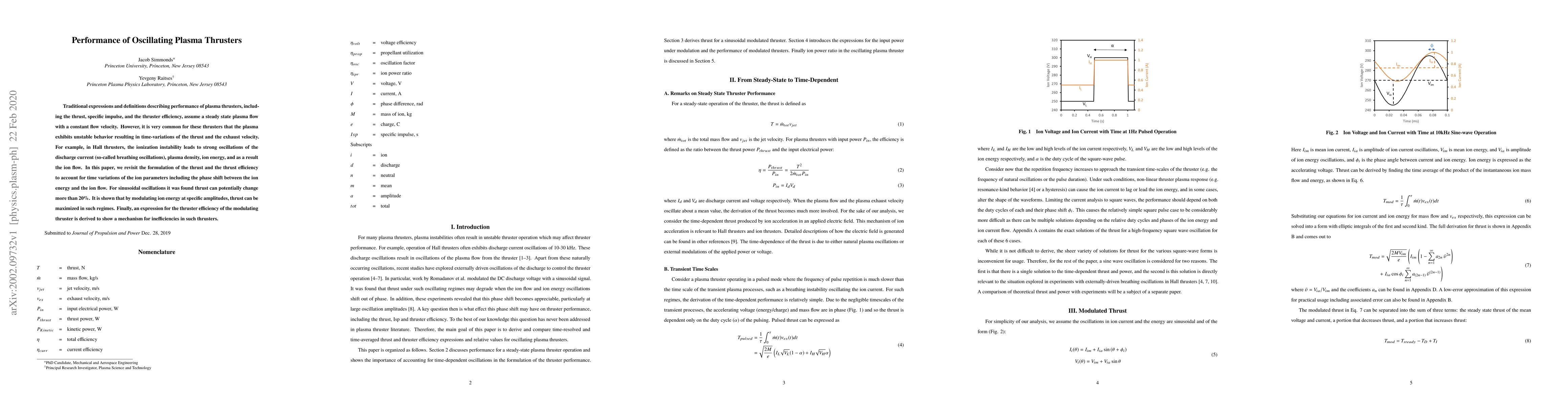Researchers found that oscillating plasma thrusters can experience thrust changes of up to 20% due to time-varying ion parameters, but modulating ion energy can maximize thrust. An expression for thruster efficiency was derived, highlighting a potential mechanism for inefficiencies in such systems.